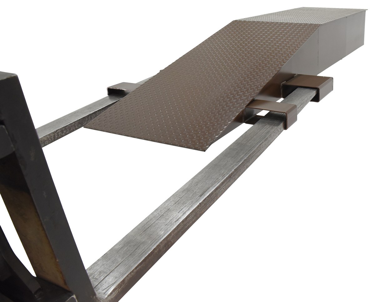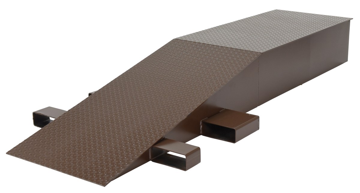 Wheel risers are designed to raise trailers to an appropriate crossover height for loaded fork trucks. Made of heavy-duty welded steel construction, these wheel risers are built to last! Each riser is equipped with fork pockets for easy transportation wherever a fork truck is available. Ramps may be stacked for convenient storage when not in use. Wheel risers are sold and priced as individual units.
