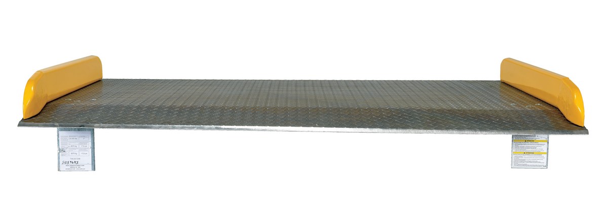 The Aluminum truck dock board with steel safety curbs is designed for portability and safety. The deck is made of tough high strength aluminum tread plate. The edges are beveled for smooth entry and exit. Safety curbs are coated yellow and are constructed of steel with cast tapered ends. Steel legs are bolted on for increased durability. Canted locking legs for easier truck portability. Manufactured in compliance with OSHA. The capacity is based upon the heaviest type of equipment used plus the maximum load carried times the single axle rating of total load. Dynamic loading, driver tendencies, speed and frequency of use must be considered. When using three-wheeled fork trucks order dock board with capacity at least four-times the lifting capacity of fork truck. The width of the dock board should be at least fifteen (15) inches wider than the load or equipment passing between the curbs. If the load does not pass between curbs, but is elevated above, add fifteen (15) inches to overall width of equipment.