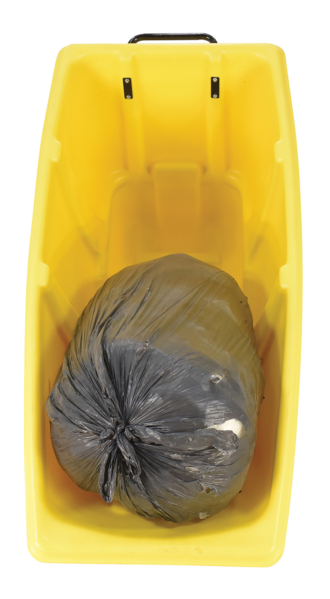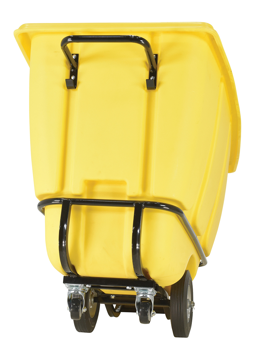 Durable plastic construction allows for collecting waste from multiple bins at a collective time. Great for warehouses, fairs, ball parks, schools, etc. Strong, one-piece molded polyethylene body with steel base tip support and a balanced design to allow for simple dumping by one person. Easily portable on 2 large rubber wheels and two swivel wheels. Not for use with fork trucks. Yellow color design.