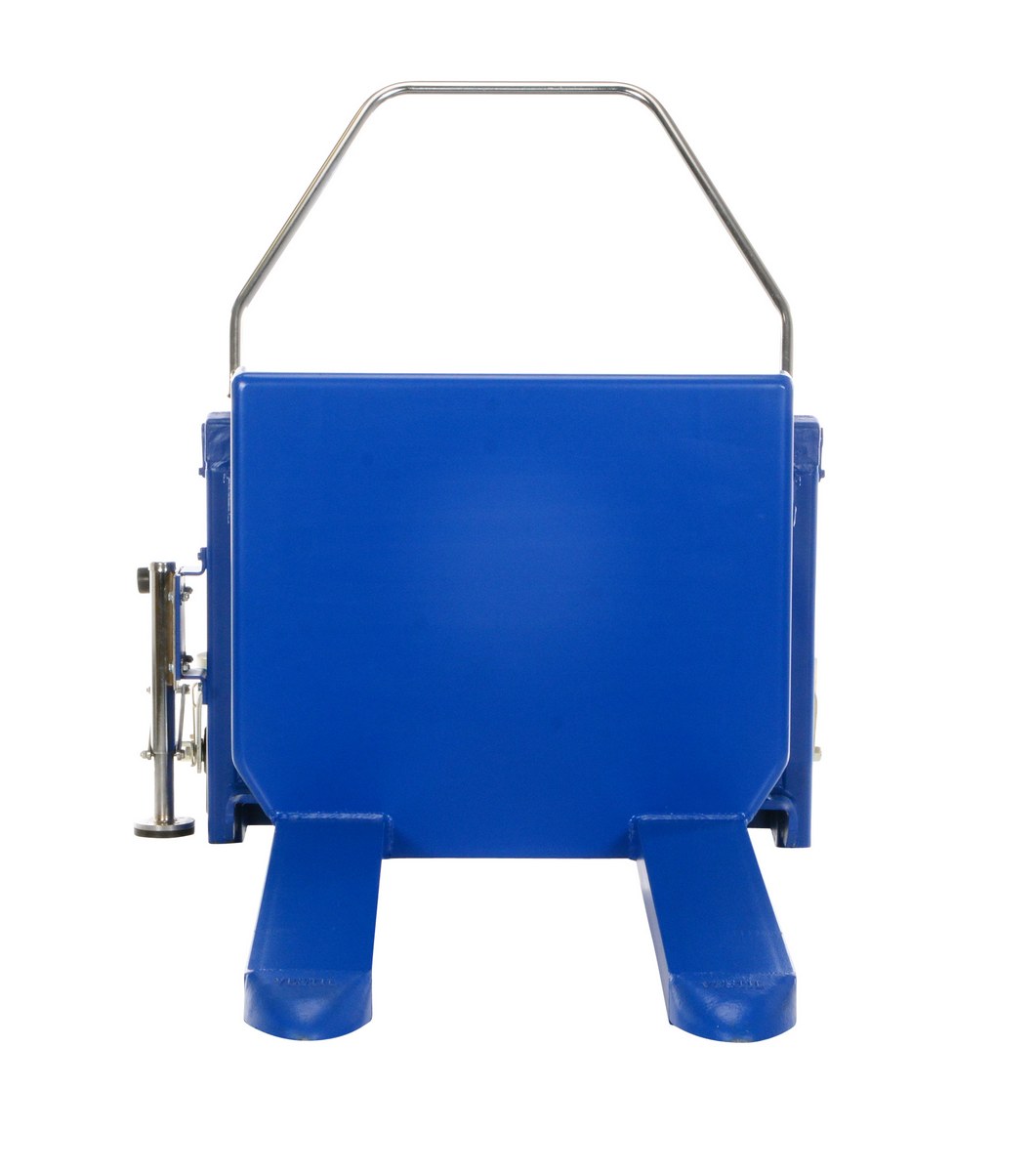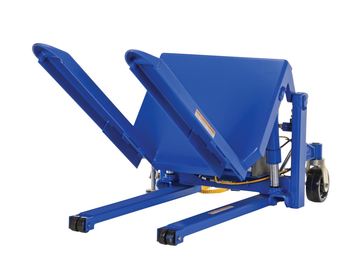 The tilt master lifts and positions filled tote boxes or baskets without the need of a fork truck or lift table using the newly designed heavy-duty tilt master. The tilter will function as transporters by moving completed products from work station to work station without waiting for a fork truck. The lift has a thin profile to allow the user to get as close to the load as possible, a standard floor lock and rolls easily on the phenolic steering wheels. It is designed to be used with open bottom pallets or skids. This unit is powered by an electric AC motor.
