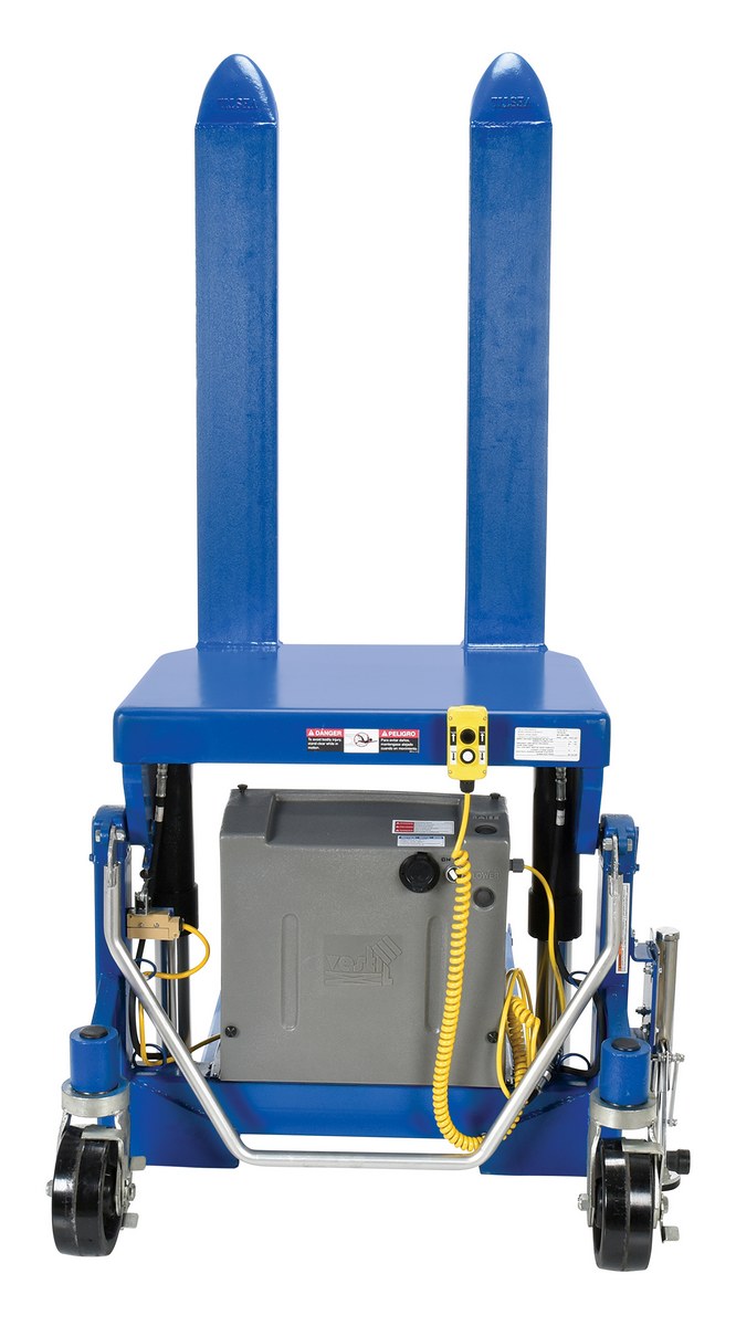 Steel Tilt Master AC Powered 4,000 Lb. Capacity BlueThe tilt master lifts and positions filled tote boxes or baskets without the need of a fork truck or lift table using the newly designed heavy-duty tilt master. The tilter will function as transporters by moving completed products from work station to work station without waiting for a fork truck. The lift has a thin profile to allow the user to get as close to the load as possible, a standard floor lock and rolls easily on the phenolic steering wheels. It is designed to be used with open bottom pallets or skids. This unit is powered by an electric AC motor.