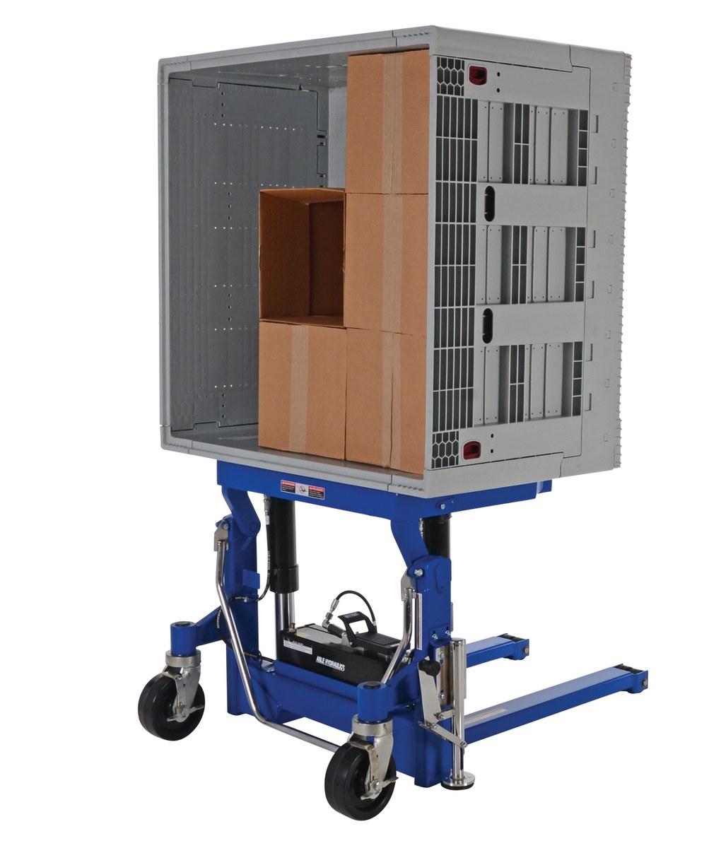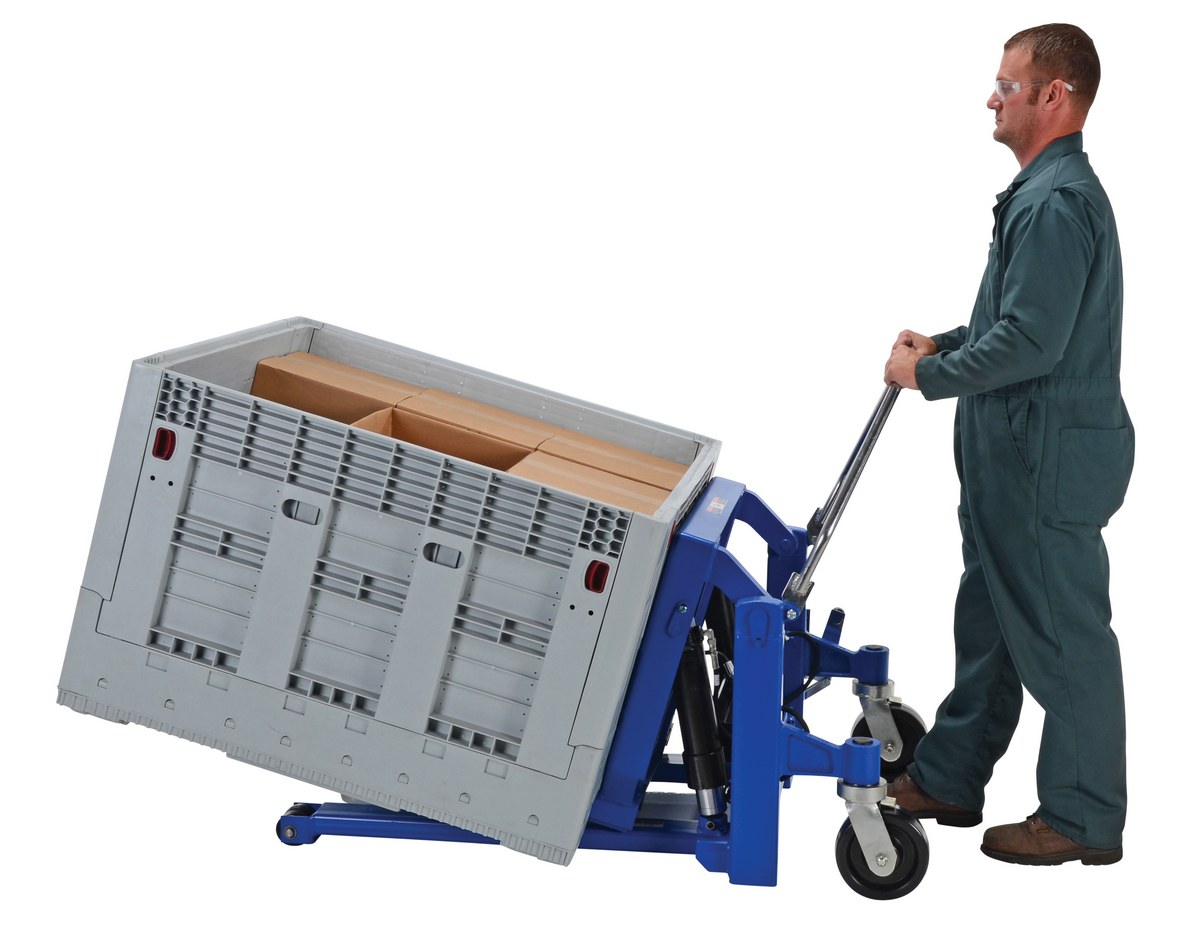 The tilt master lifts and positions filled tote boxes or baskets without the need of a fork truck or lift table using the newly designed heavy-duty tilt master. The tilter will function as transporters by moving completed products from work station to work station without waiting for a fork truck. The lift has a thin profile to allow the user to get as close to the load as possible, a standard floor lock and rolls easily on the phenolic steering wheels. It is designed to be used with open bottom pallets or skids. The unit is powered by an air pneumatic motor.