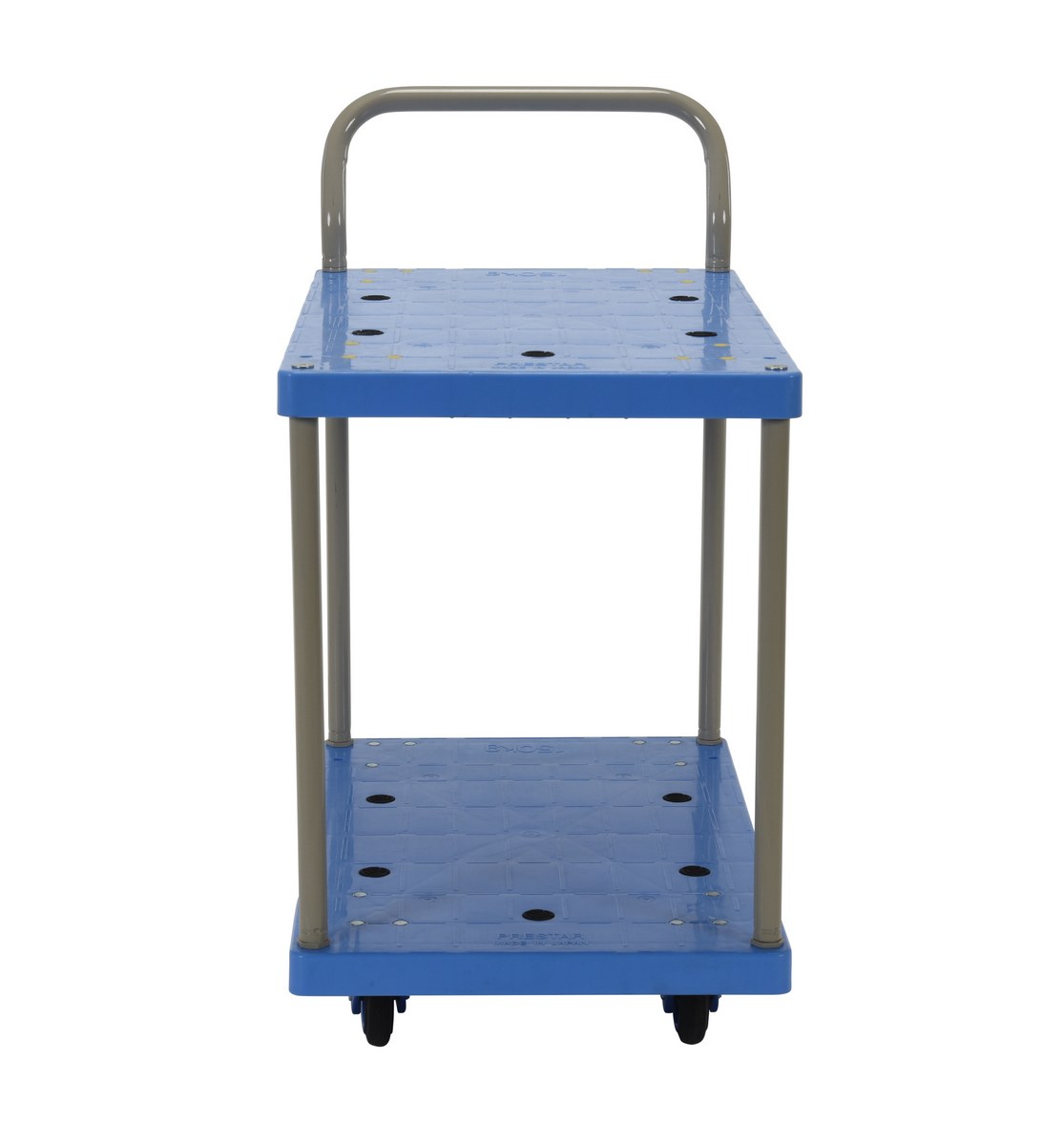 Plastic Truck Double Deck with Floor Brake 31-5/8 In. x 17-7/8 In. x 33-7/8 In. 330 Lb. Capacity BlueThe plastic platform cart is a great addition to the shipping and distributing facilities. The double deck plastic platform creates a durable, yet lightweight construction that can be transferred simply from workstation to workstation. The unit rolls on casters for smooth transference over a variety of terrains, while the brake keeps the unit steady when not in progress. The attached handle creates a more ergonomic posture of personnel during use.