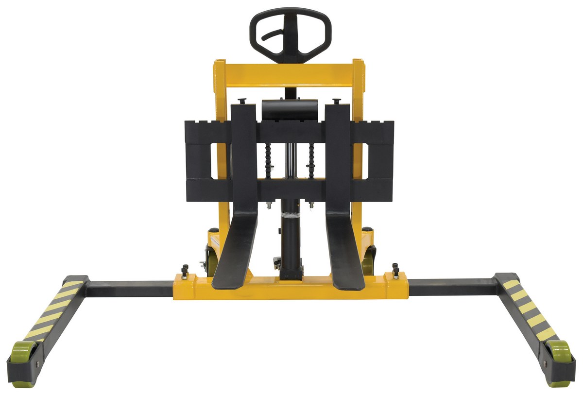 Steel Stacker Manual Pump 2-5/8 In. - 17 In. Fork Height 3,000 Lb. Capacity Black / YellowManual Hydraulic hand pump stackers are sturdy and compact to fit through standard height doors. Forks are raised by manual hydraulic hand pump operation and released by a lever situated on the handle. 1" lift per handle pump. Two rigid and two swivel wheels standard.