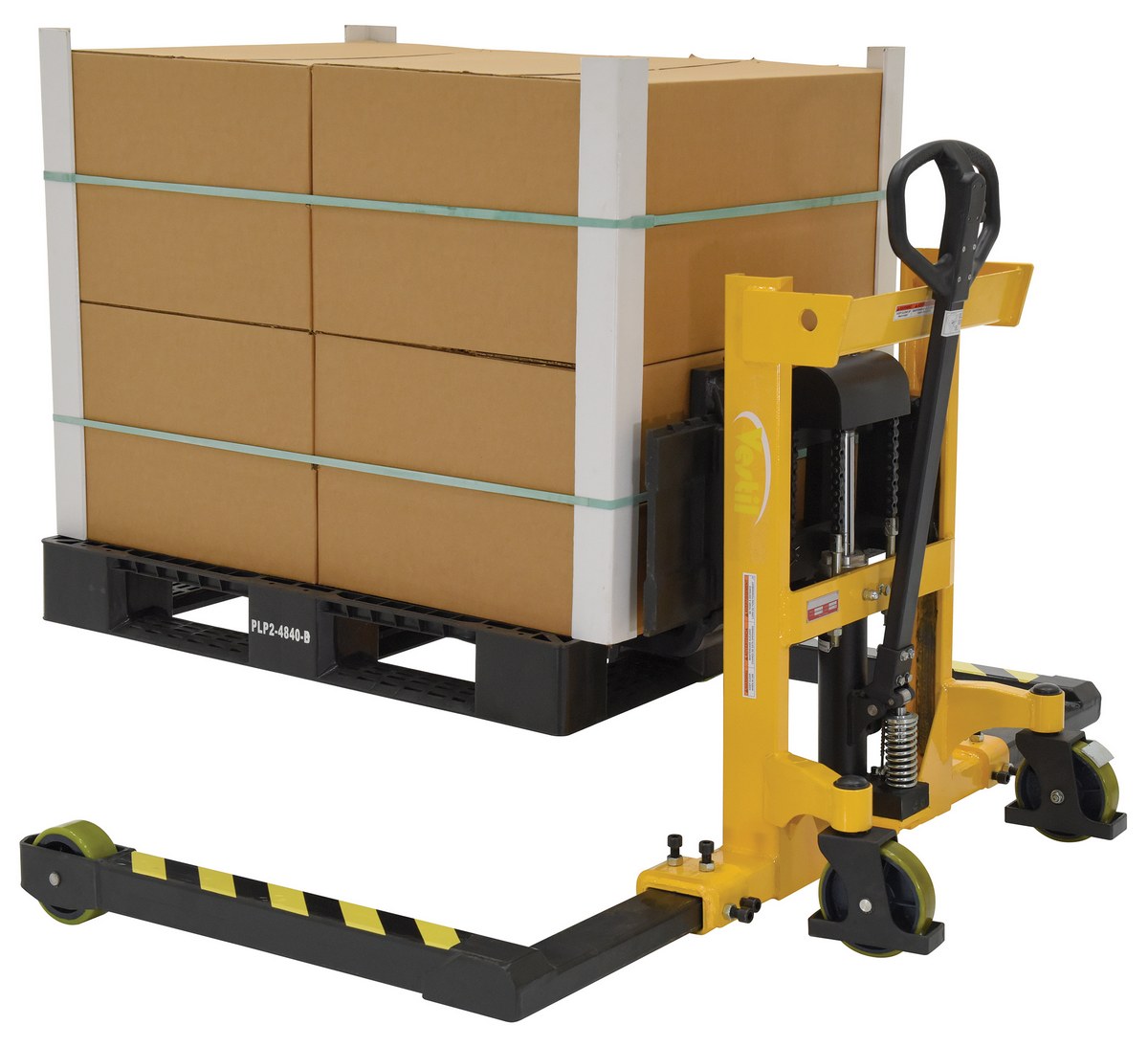 Manual Hydraulic hand pump stackers are sturdy and compact to fit through standard height doors. Forks are raised by manual hydraulic hand pump operation and released by a lever situated on the handle. 1" lift per handle pump. Two rigid and two swivel wheels standard.