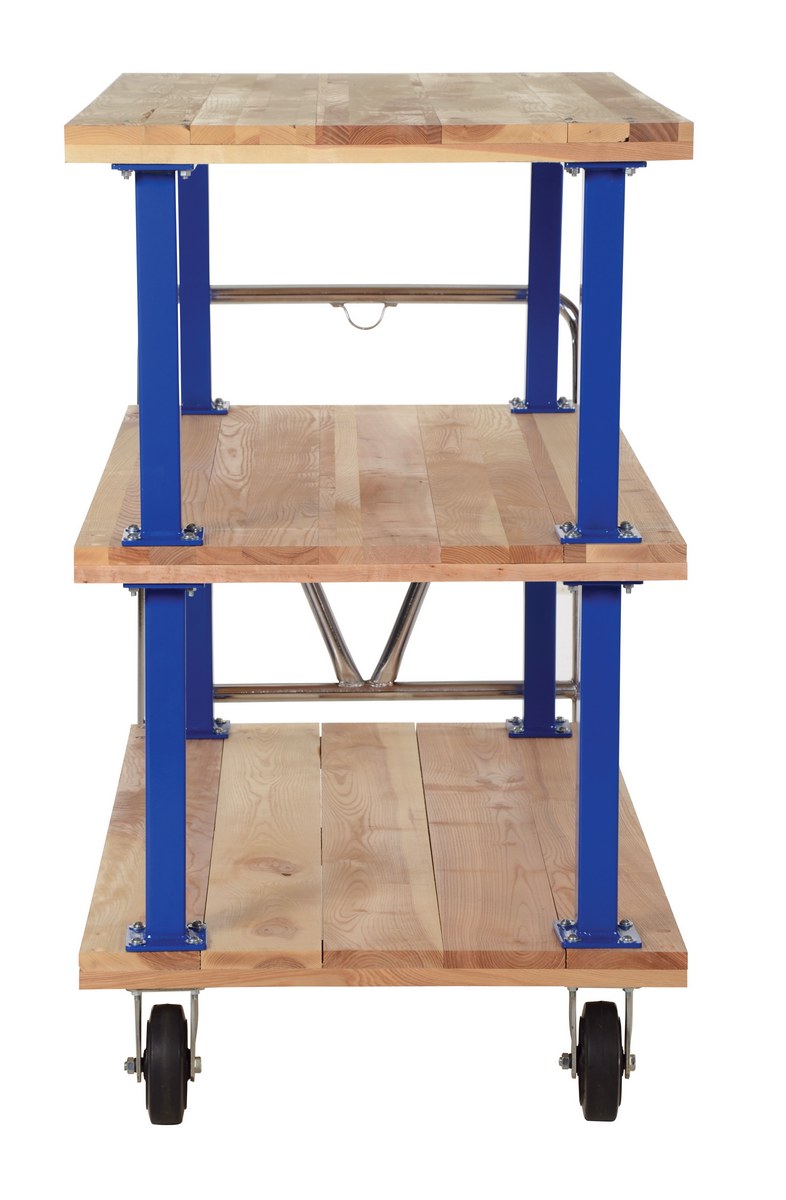 Minimize lifting and bending with this triple decker Hardwood platform cart/portable work bench. Ideal for shipping areas, offices, and plant use, this economical cart is perfect for many of your applications. Countersunk holes allow for a smooth deck surface.