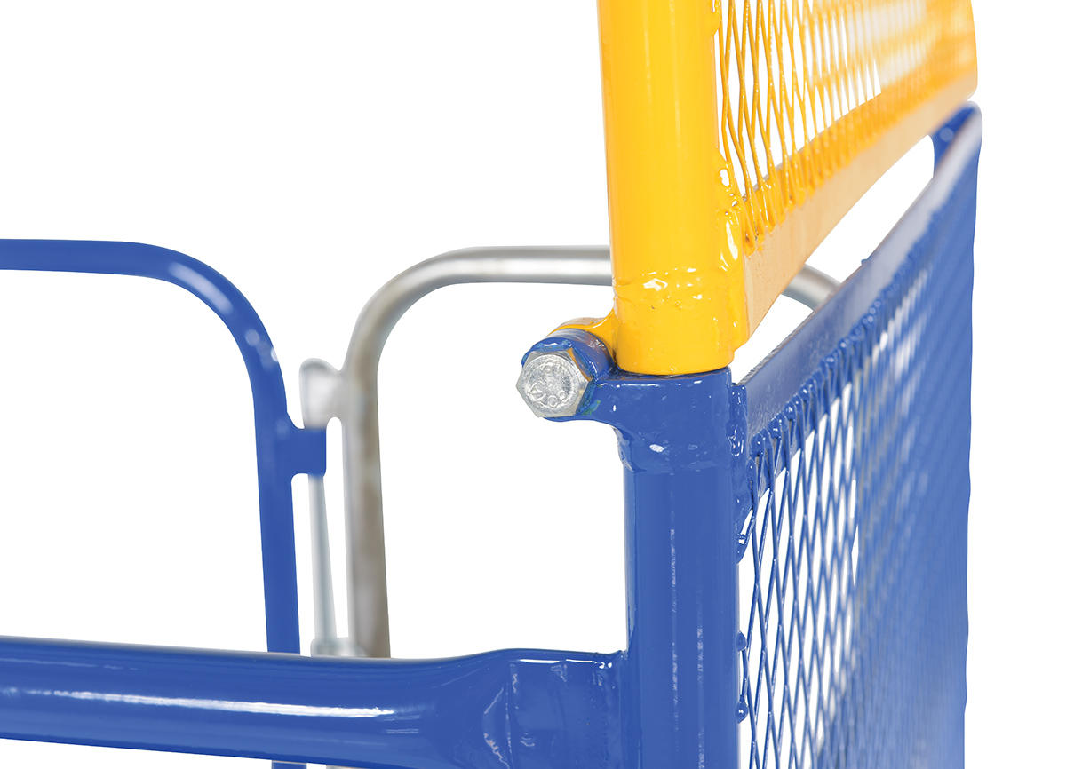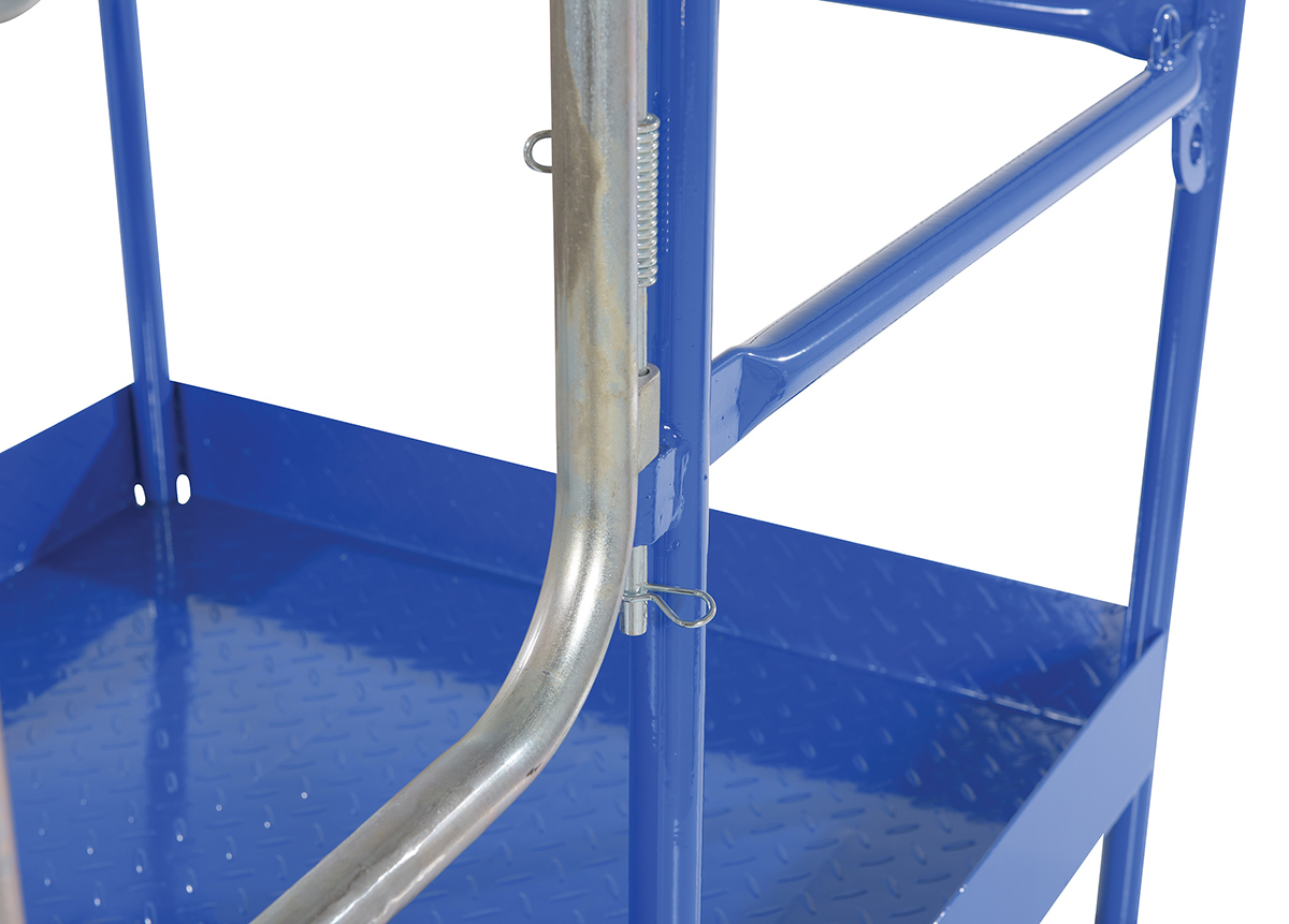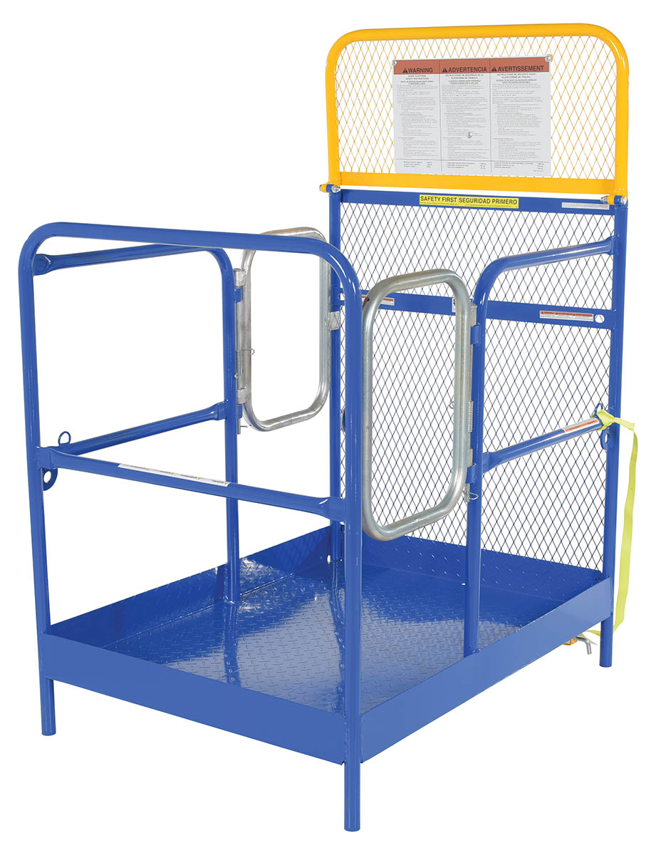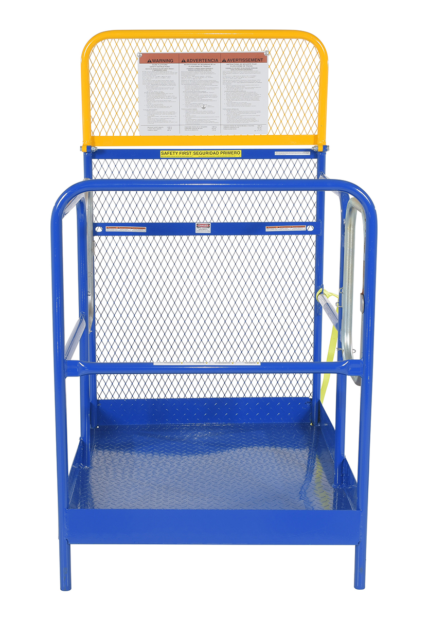 This convenient fork truck work platform quickly and safely raises maintenance personnel where they are needed. Attaches to fork truck by inserting forks into fork pockets and securing platform to fork truck. Fork locks secure platform to forks. Dual handrails on three (3) sides with expanded metal backing on the fourth side. Includes checker floor plate platform and long strap with hook to attach platform to fork truck. A maximum of two (2) people can be in the work platform at one time.