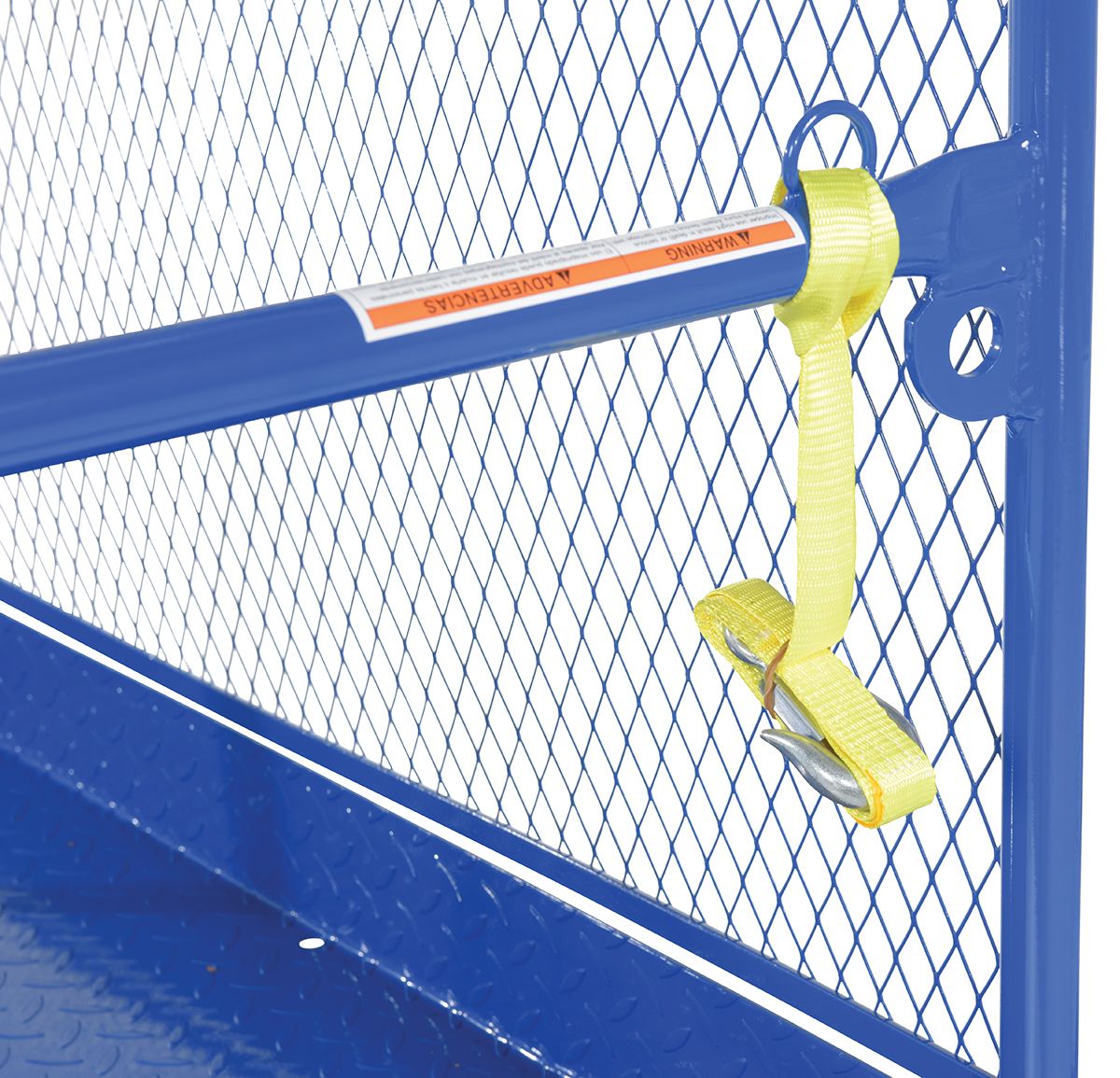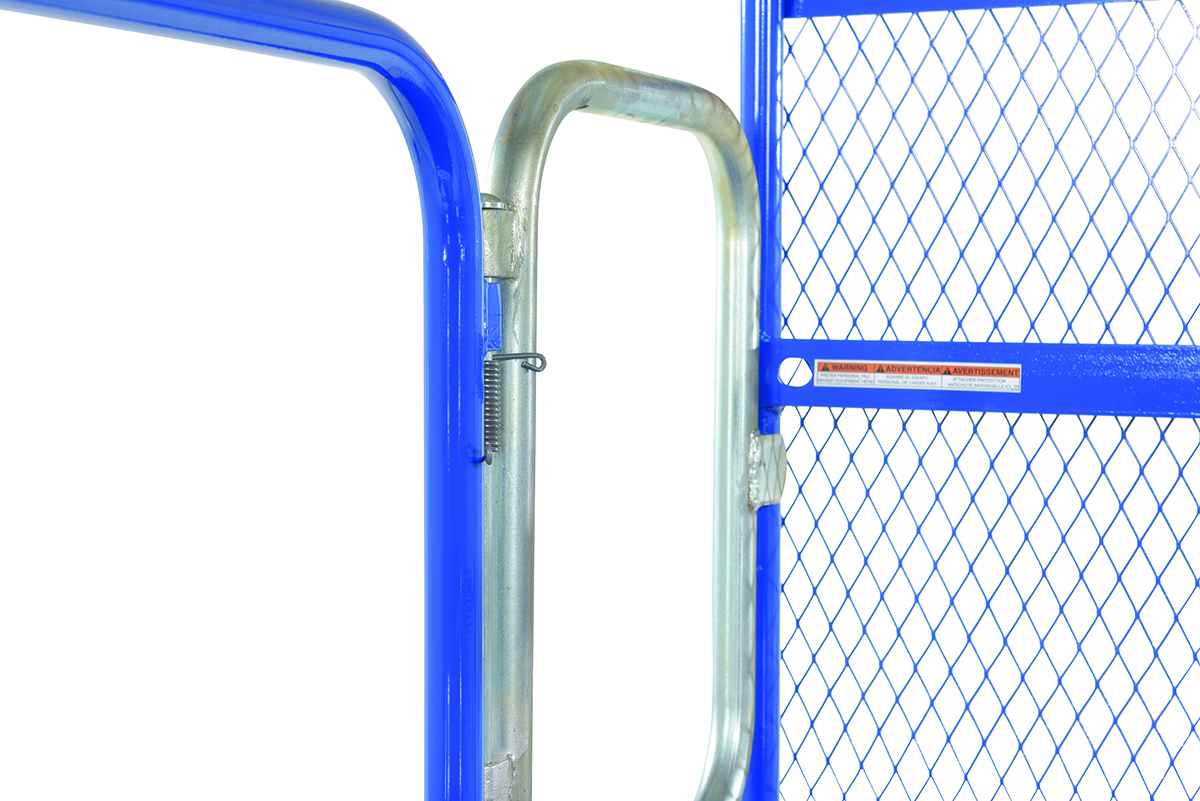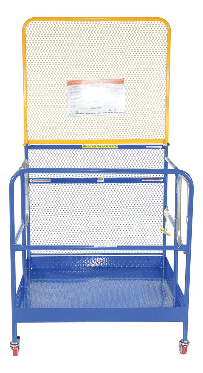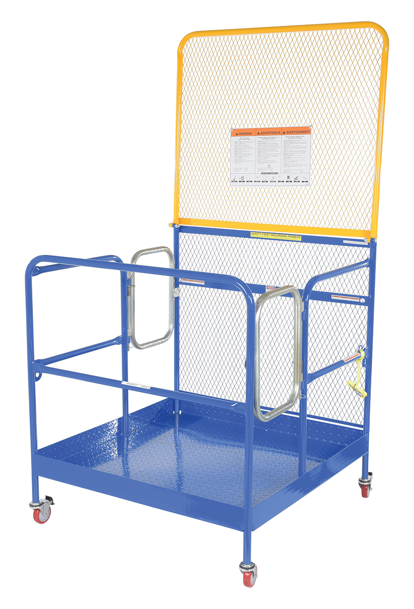 Steel Work Platform With Poly Casters, 2 Door Entry, and 84 In. Expanded Back 48 In. x 48 In. 1,000 Lb. Capacity BlueThis convenient fork truck work platform quickly and safely raises maintenance personnel where they are needed. Attaches to fork truck by inserting forks into fork pockets and securing platform to fork truck. Fork locks secure platform to forks. Expanded metal backing on fourth side. Includes checker floor plate platform and long strap with hook to attach platform to fork truck. A maximum of two (2) people can be in the work platform at one time. Meets California OSHA specifications.