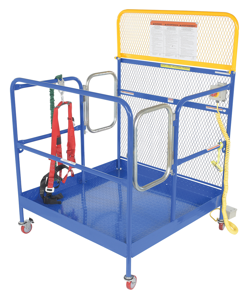 Steel Full Featured Work Platform With Poly Casters and 2 Door Entry 48 In. x 48 In. 1,000 Lb. Capacity BlueThis convenient fork truck work platform quickly and safely raises maintenance personnel where they are needed. Attaches to fork truck by inserting forks into fork pockets and securing platform to fork truck. Fork locks secure platform to forks. Expanded metal backing on fourth side. Includes checker floor plate platform and long strap with hook to attach platform to fork truck. A maximum of two (2) people can be in the work platform at one time. The full featured units include an emergency stop button kit and web lanyard with XL safety harness. Alternate size harnesses available upon request, S-XL (XXL & XXXL available at an additional charge).