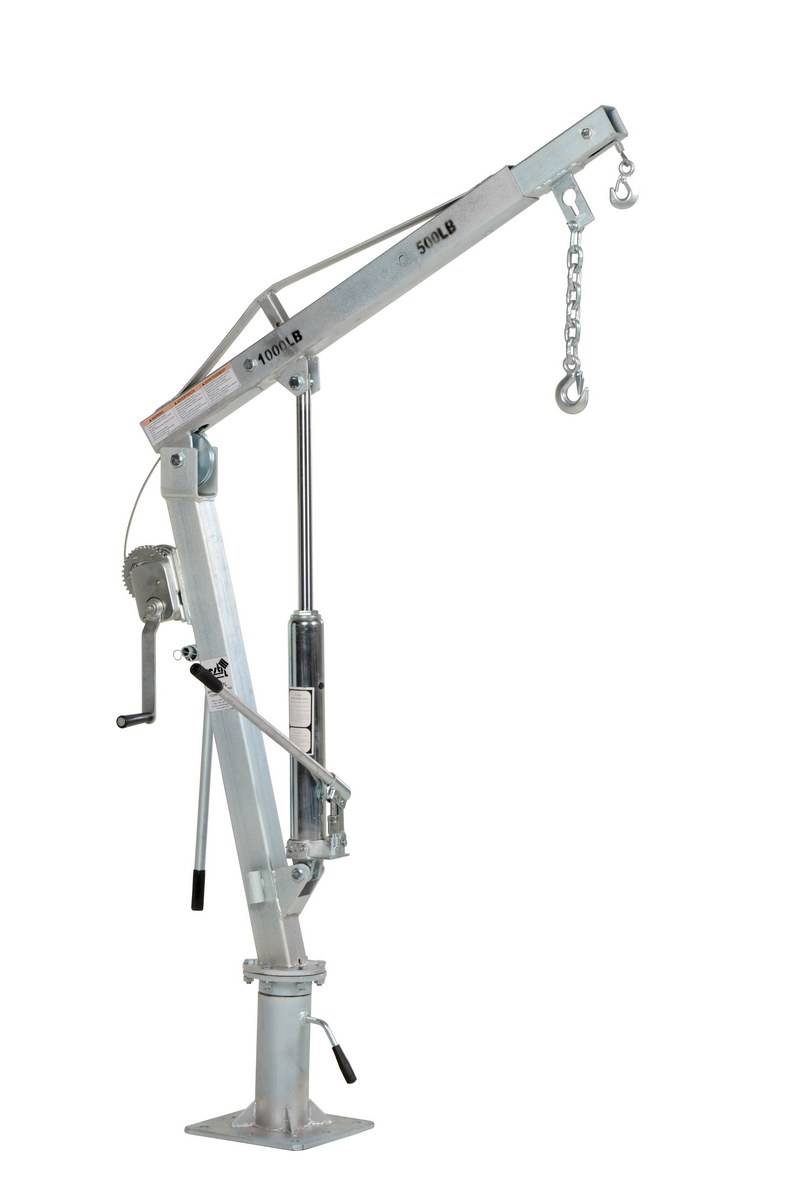 Galvanized Steel Winch Truck Jib Crane 500 Lb. Extended Capacity GrayThis Galvanized winch operated truck Jib crane lifts items from ground to truck bed height, then rotate into cargo area. Includes telescopic boom design with manual hydraulic hand pump to pivot boom up and down. Manual cable winch to lift and lower loads. Unit comes with one grab hook, one chain slot lock, and one sling hook with latch. Unit is designed for vertical lifting only. Do not use unit for lifting personnel or overhead lifting.