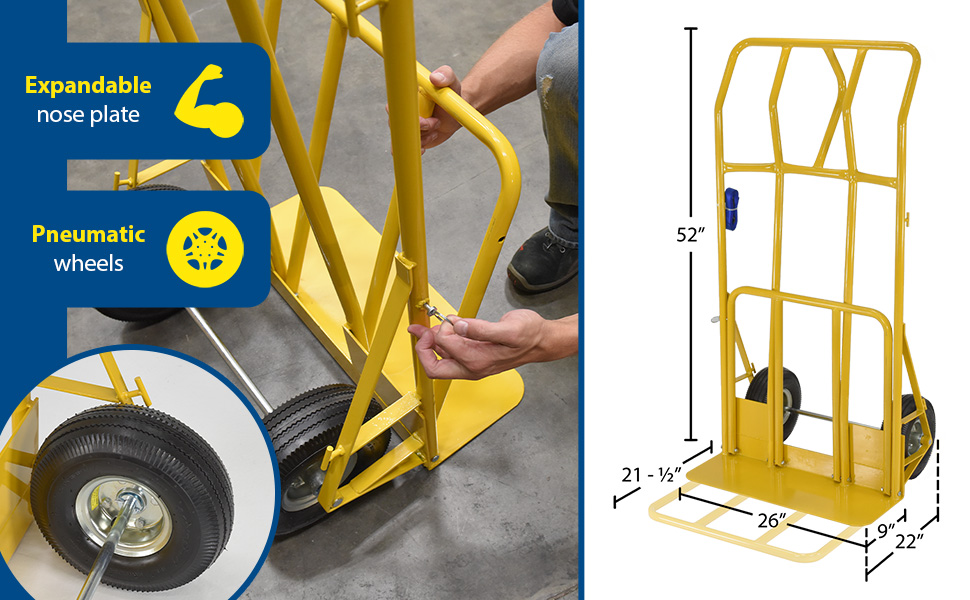 These heavy duty, extra wide hand truck with a folding extension nose plate are ideal for handling large, bulky items. Extra strong tubular, steel frame. Baked-in powder-coated toughness. A strap is included to hold items in place while transporting.