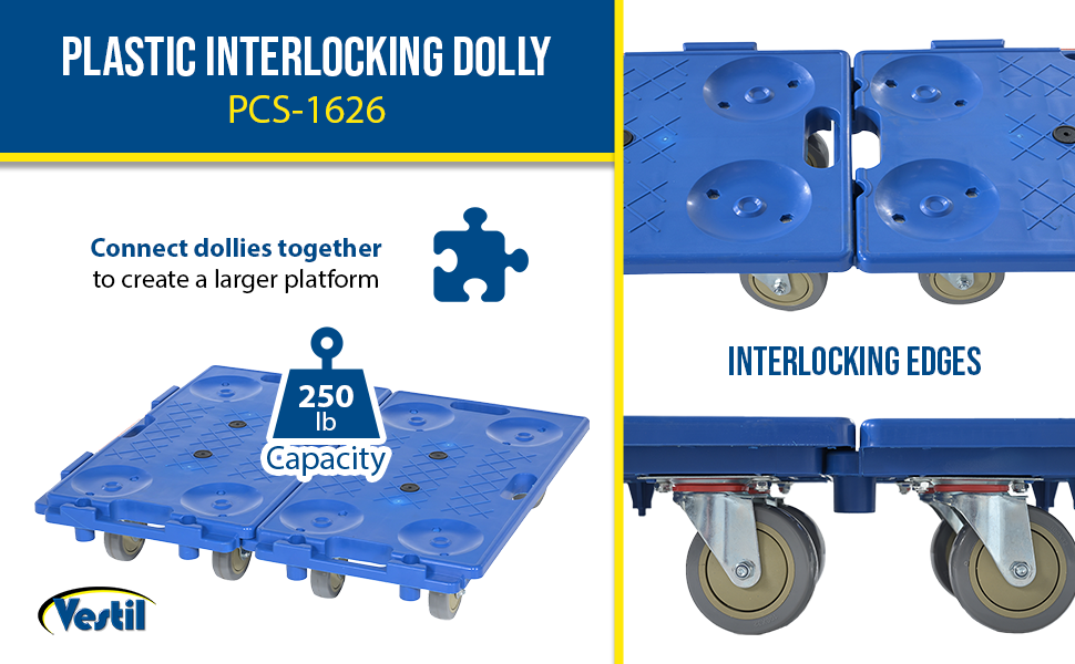 PCS-1626 PCS-1626Plastic Interlocking Dolly 26-3/4 In. x 15-3/4 In. x 6-1/2 In. 250 Lb. Capacity BlueUniform Capacity (lb.): 250
