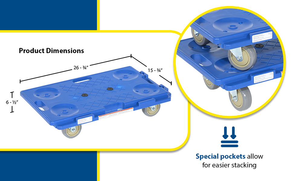 Strong, lightweight dollies include special interlocking edges that allow users to connect multiple dollies together to form a larger platform size. Hand holes are included for convenient carrying, while special pockets in the deck allow for easier stacking. Units roll on (4) swivel 4" x 1-1/4" polypropylene casters. Handle height when installed is 26".