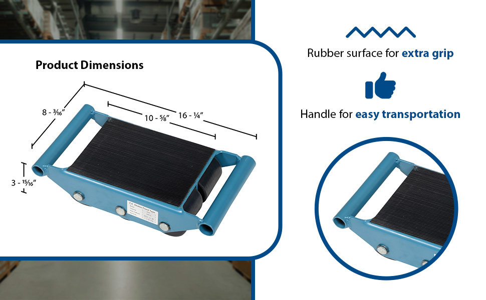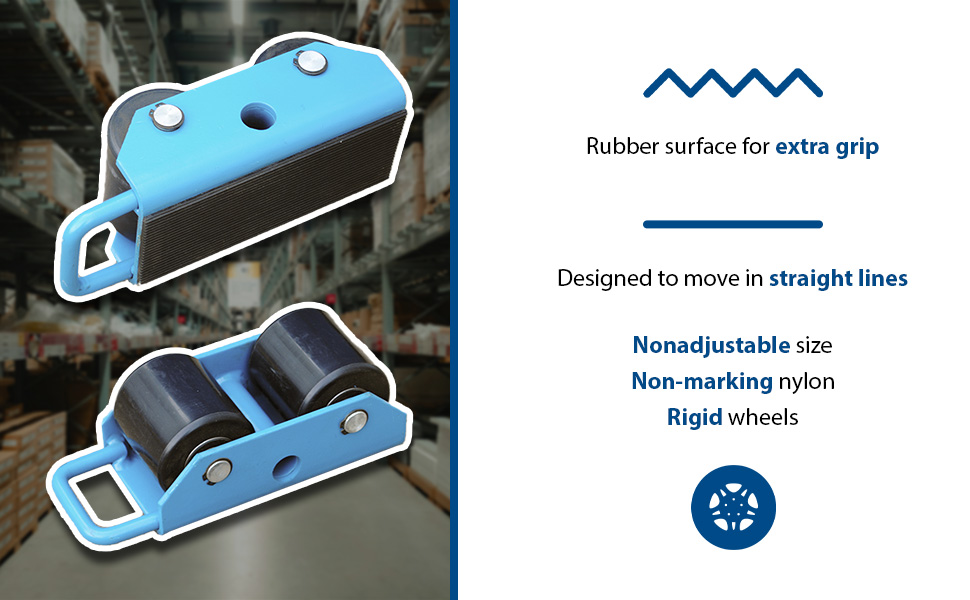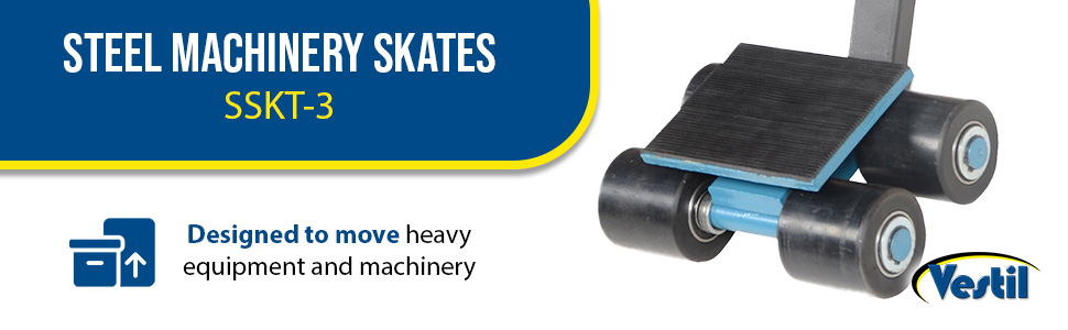 Sometimes moving heavy equipment can be a difficult process. But, with a machinery skate things get a whole lot easier! The high capacity design lets the user transfer large, heavy, and oversized loads without the need of costly industrial lifting equipment.These skates are designed to move heavy equipment and machinery. Nylon wheels are strong and will not mark floors. The top of each skate includes a rubber surface for extra grip. Steel construction with handle to carry and position.