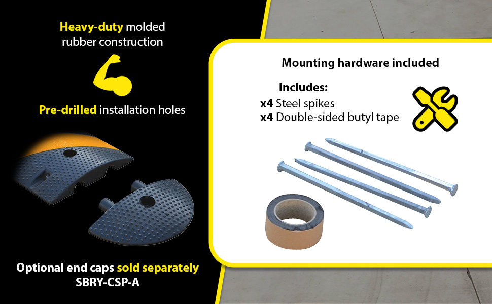 SBRY-CAP-A SBRY-CAP-ARubber Heavy Duty Speed Bump Asphalt End Caps BlackPackage Contents: (2) End caps, (2) asphalt spikes, (1) roll of butyl tape