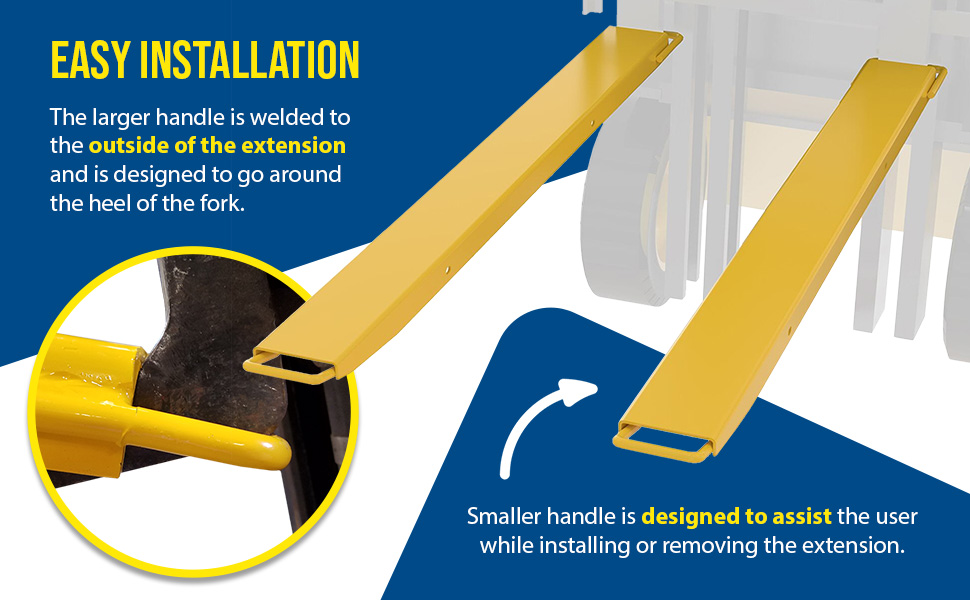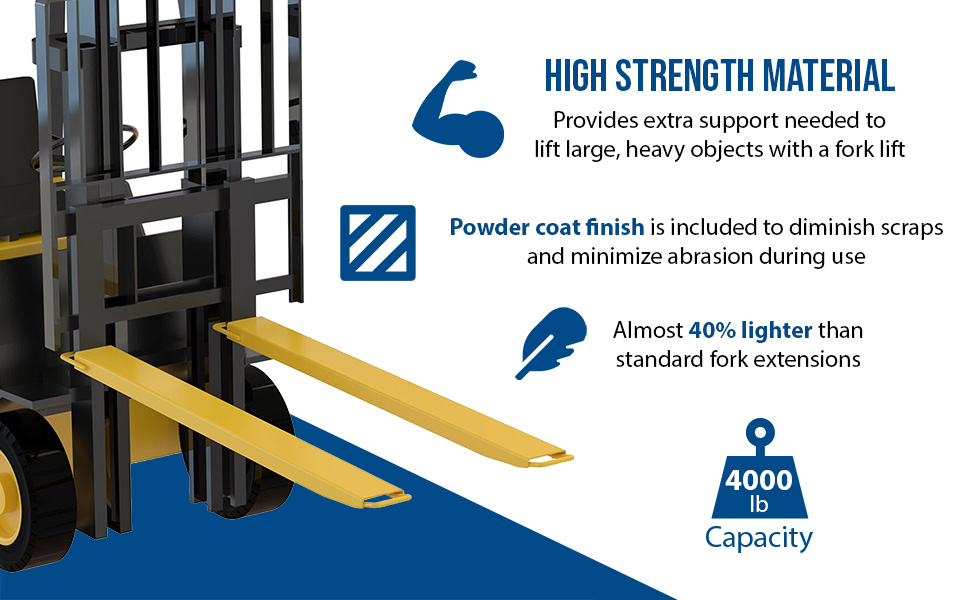 High Strength Fork Extensions are the perfect accessory for new or existing forks. The high strength material provides extra support needed to lift large heavy objects with a fork lift. A 3/16" thickness and included lifting handle for simple placement of the extension onto the lifting fork. These models are almost 40% lighter than standard fork extensions. 4,000 pound capacity is evenly distributed per pair. A powder coat finish is included to diminish scraps and minimize abrasion during use. Baked-in powder coat finish for added toughness.