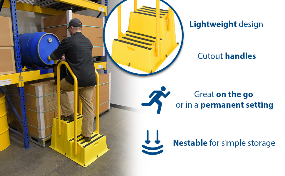 SPN-2-YL-HR-PO SPN-2-YL-HR-POPolyethylene Nestable with Handrails Casters 2 Step 500 Lb. Capacity YellowUniform Capacity (lb.): 500