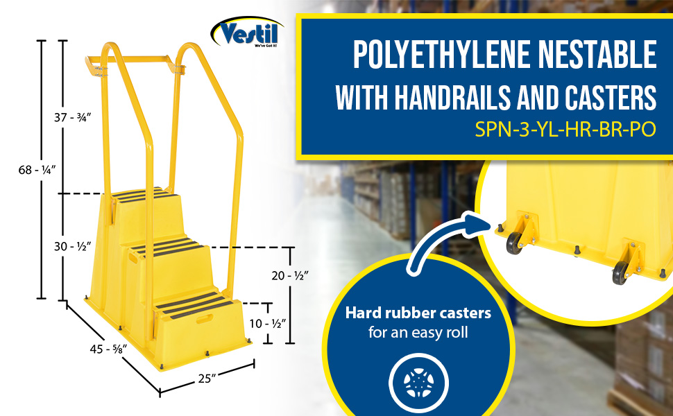 SPN-3-YL-HR-PO SPN-3-YL-HR-POPolyethylene Nestable with Handrails Casters 3 Step 500 Lb. Capacity YellowUniform Capacity (lb.): 500