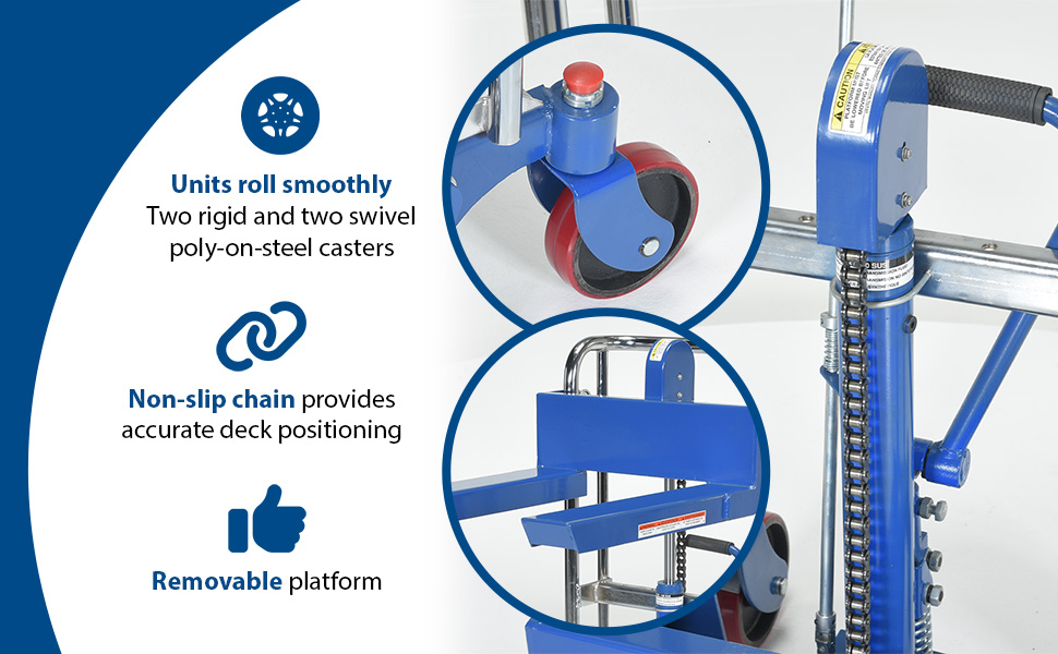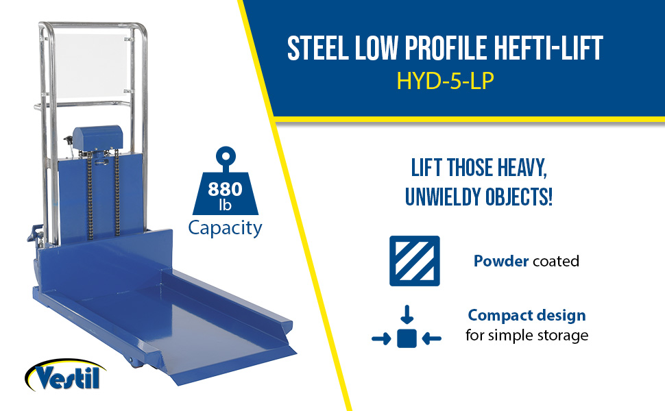 The Hefti-Lift units provide reliable powerful lifting when moving and positioning loads. The manual hydraulic foot pump yields 3/4" of platform travel per stroke, auto-shift models feature a two speed foot pump.The units roll smoothly on two rigid and two swivel poly-on-steel casters with foot operated brake. The units are designed of welded steel construction with chrome platforms and uprights (except model HYD-10-DA-SS) Each fork is 4-1/2"W x 2-1/2"H, the fork length is the same as the platform length. Overall fork width is 22". Not for use with pallets. Stainless Steel units are compact, lightweight, and capable of turning in a small radius when space is limited. A built-in automatic load check valve is included for improved safety. Model HYD-5-SS features a hydraulic foot pump, while model HYD-10-DA-SS comes with a dual acting manual hydraulic hand pump.