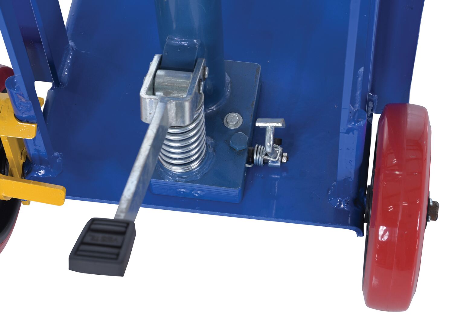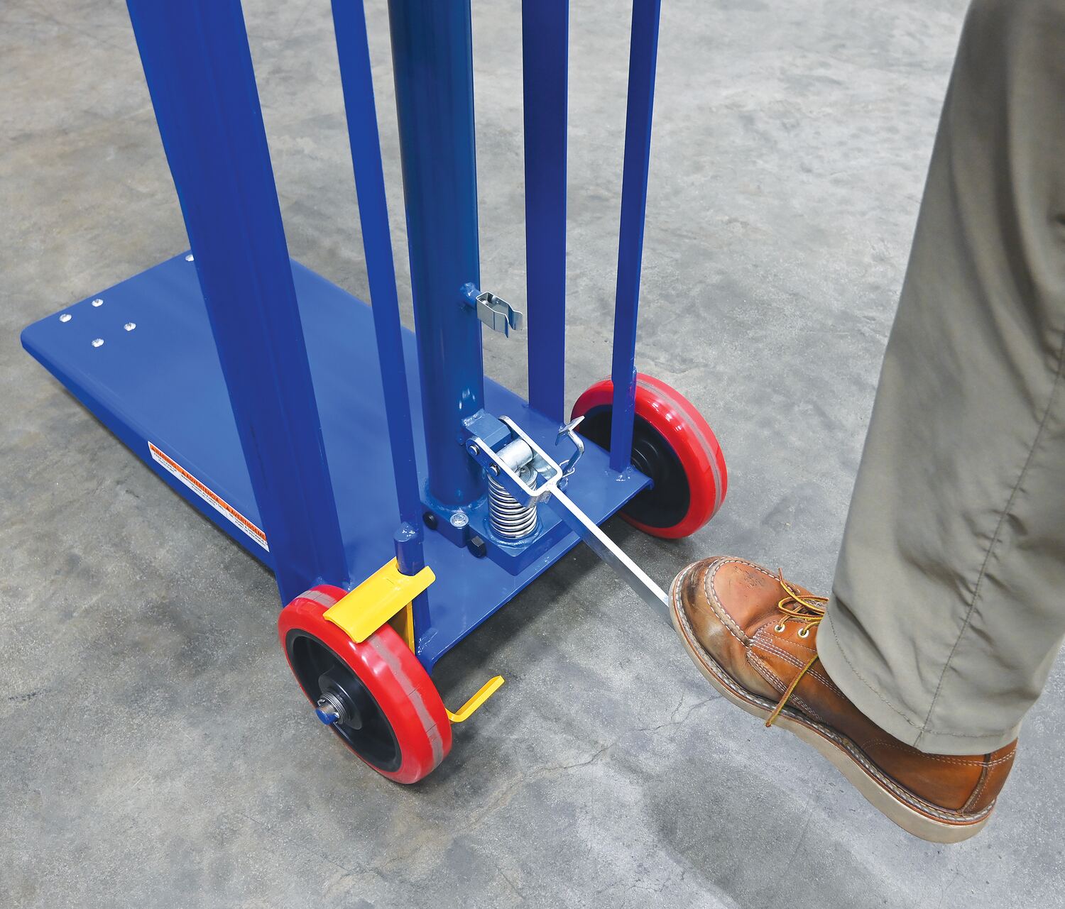 Transport loads in the lowered position and maneuver work materials to an ergonomic height. Ideal in compact work areas. Safe and easy one person handling of loads up to 1,000 lbs. An efficient way to unload heavy objects from semi trailers. Rugged steel construction for years of service. Dependable precision built hydraulic system is activated by easy action foot lever. Additional rollers on the handle make loading into a delivery truck easy. Steel construction. Approximately 1" of lift per pump. Models HYDRA-2 & HYDRA-4 come standard with a single wheel brake. HYDRA-HD has (2) two swivel casters with brakes. Baked-in powder coat finish for toughness.