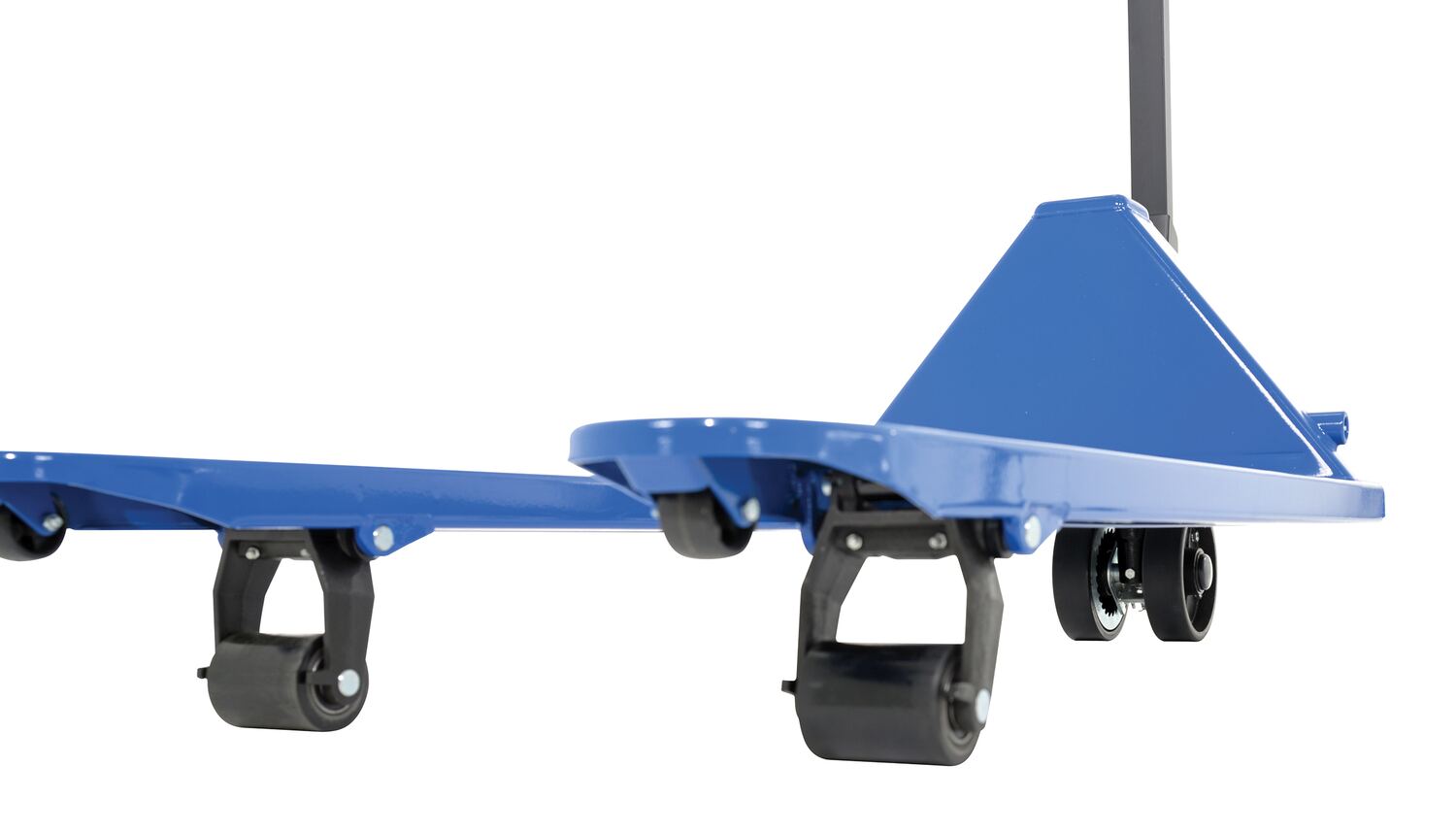 These power assist pallet trucks combine traditional hydraulic pallet jack lifting with an added travel-assist feature for smoother load movement. Operators can quickly lift and lower loads with the hydraulic hand pump, while the integrated assist controls help support forward and reverse travel when engaging the handle properly. Nose wheels positioned at the front edge of each fork help provide cleaner pallet entry and exit for improved handling in daily operations.