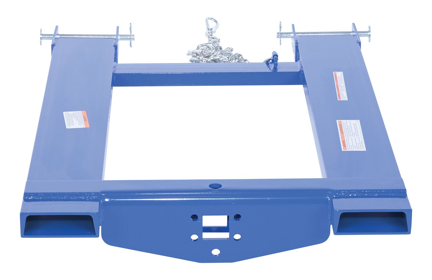 Convert your fork truck into a tow truck for moving trailers and other portable equipment. Simple design slides onto forks and secures into place with pin style tine locks and a safety restraint. Welded steel construction with blue baked-in powder-coat finish for added toughness. 5"W x 2"H usable fork pockets. Optional pintle hook, tow balls, fifth wheel trailer spotter, lifting hooks and hitch available. Bolt on design. Never exceed the 4,000 lb. capacity of the hook base. An attachment does not increase the total capacity of the unit.