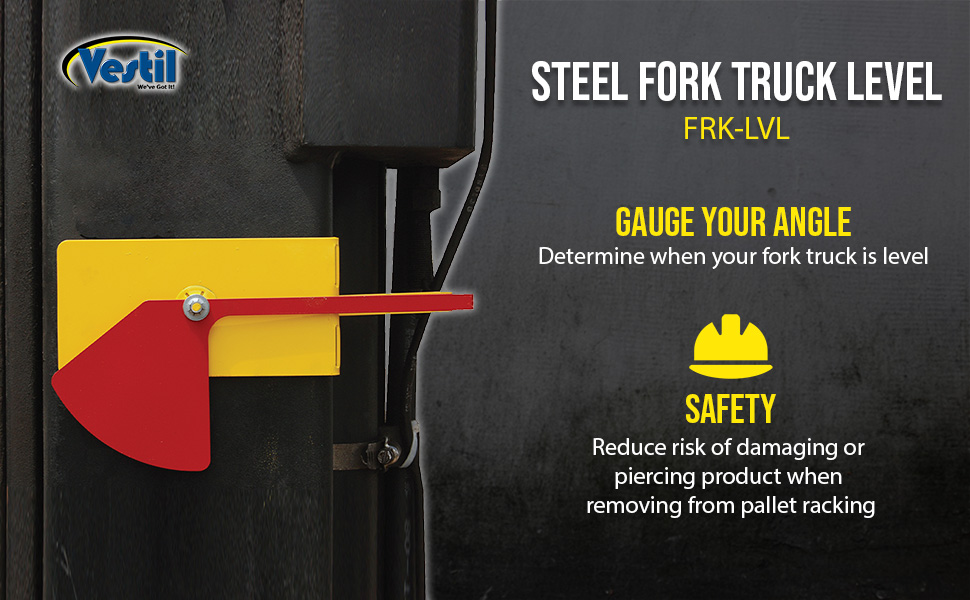 Designed to aid the fork lift driver in determining when the forks are level. Unit reduces the risk of damaging or piercing product when removing it from pallet racking. Fasten the steel leveler to the mast of the fork lift. While tilting the forks to the desired angle, the fork leveler will tilt as well, showing that the forks are not currently in a horizontal position. When forks are moved back into a safe level angle, the leveler will be perfectly horizontal.