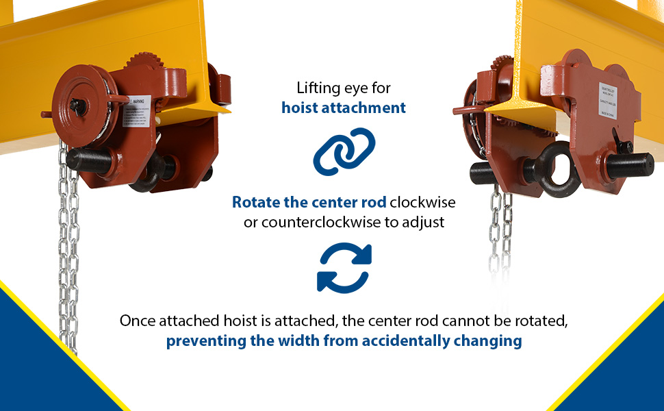 These trollies have been designed to quickly install on virtually any S, H,W, and M type I-beam. The width of the trolley is adjusted by rotating the center rod with lifting eye clockwise or counterclockwise. Once hoist (not included) is attached, center rod cannot be rotated which prevents trolley width from accidentally changing. Choose either push trolley or geared trolley. Geared trolley is ideal for use when precise positioning of the trolley is required. The trolley includes four rollers with sealed bearings for long life. A lifting eye is located at the bottom of the trolley for attaching a hoist (not included). Steel construction and painted finish. Headroom is measured from the bottom of wheel to bottom of hooking eye.