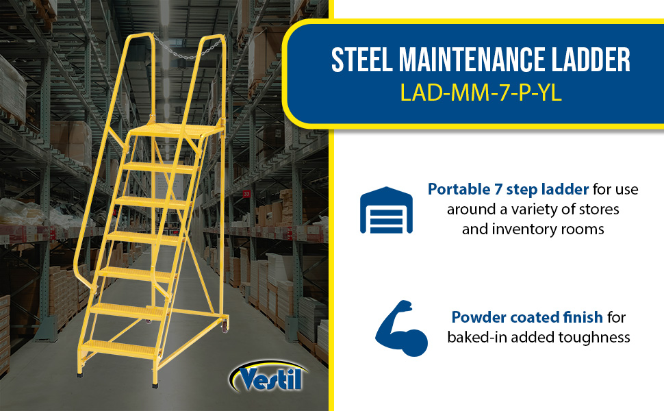 Portable ladders for use around warehouses, hardware stores or inventory rooms. Tilt the unit to allow for portability. Units roll on 4" poly-on-poly wheels. Constructed of square tubing framework which handles uniform capacities up to 350 lbs. Features 30" high removable hand railing, (36" on 12 step models), access chain, 21" deep top platform, and an industrial baked-in blue powder coat finish for toughness. Each step measures 24" wide by 7" deep and is spaced 10" apart. Model with 5-12 steps are ship crated, some assembly required. Complies with ANSI 14.7 and OSHA 1910.29 specifications.