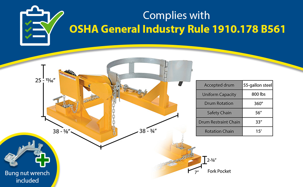 This product allows you to easily transport and rotate 55-gallon steel drums using a fork truck. Each standard unit is provided with a 15 foot long chain to allow the drum to be rotated up to 360 degrees from the fork truck operator's seat. Fork pockets measure 7-5/8"W x 2-5/8"H usable, except DCR-205-8 and DCR-205-15 usable is 7" W. DC powered units include (2) two 12V batteries, on-board charger, battery charge indicator gauge, and hand held control on a 4 ft. to 20 ft. long coil cord. Safety restraint is used to secure unit to fork truck. Bung Nut Wrench, model BNW-I-W, is also included for opening and closing drums.