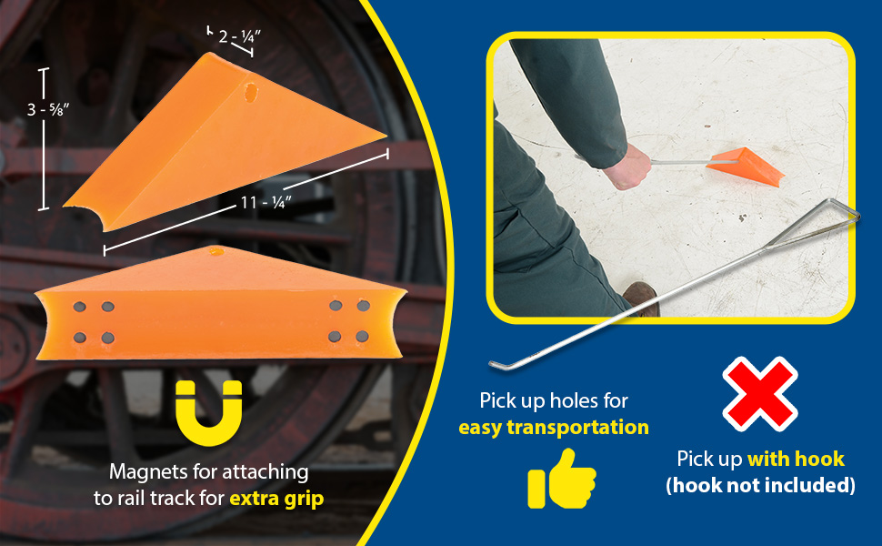 Magnetic Rail Car Wheel Chocks are designed to stabilize railcar wheels while loading and unloading. Standard features include: rail track attaching magnets for extra grip, pick up holes for easy transportation, a nylon material design for durability and longevity, and orange color for safety. Model RC-WC-HOOK allows you to pick up the Rail Chock without bending over.