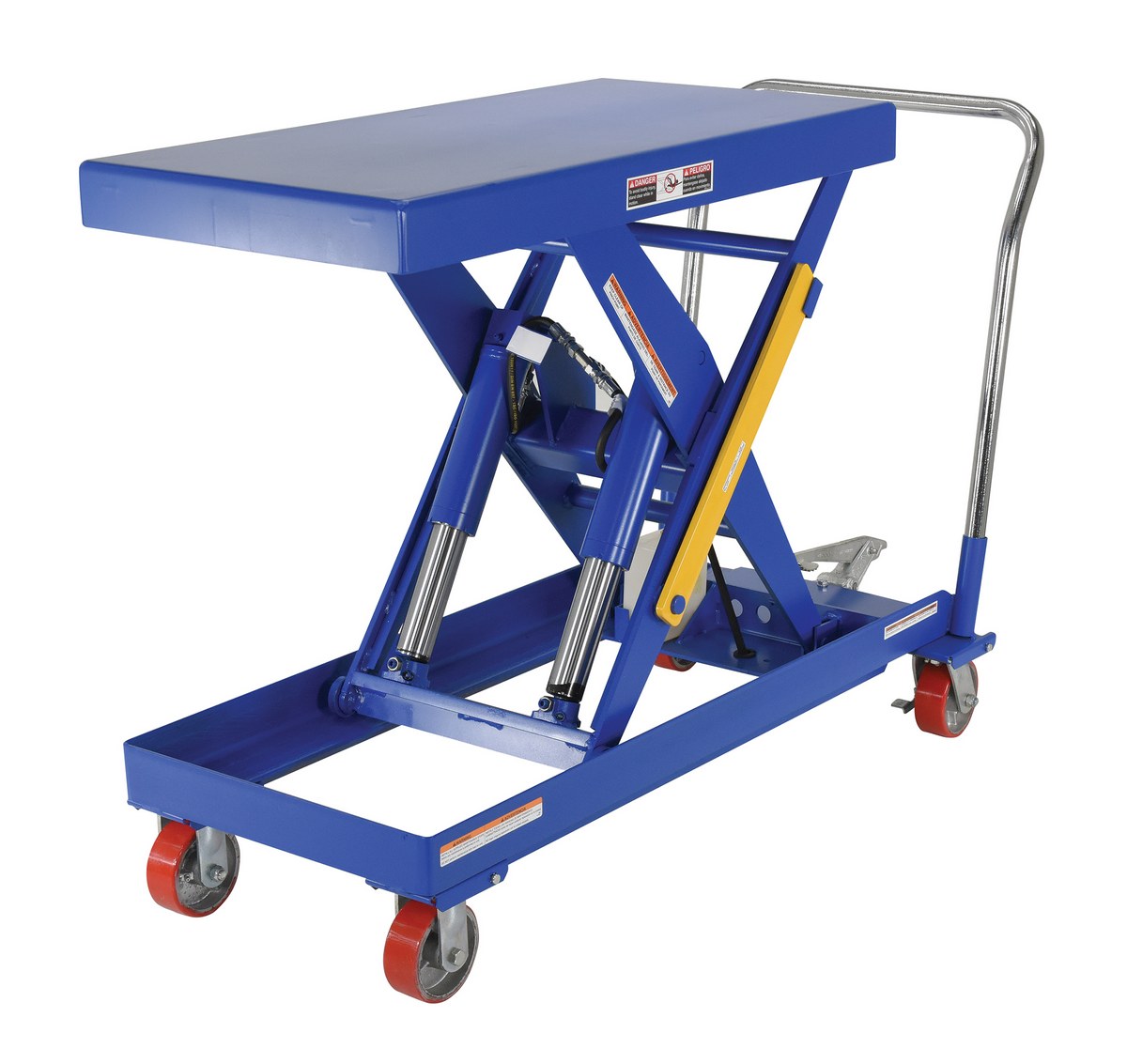 Hydraulic elevating carts are well suited for manufacturing and distributing industries. Material can be easily loaded onto a cart from a table, lowered to safe transporting height, and raised to unload at a destination. Foot pump includes a soft-lowering down valve for precise positioning and the perfect ergonomic height. The unit rolls on (4) poly-on-steel casters; two (2) swivel with brakes and two (2) rigid. The tables can be raised and lowered with a single speed foot pump, two speed foot pump or a two speed auto shifter that automatically shifts when the table is loaded. Steel construction with chrome platform and handle on all models, except model cart-200-alum which includes an aluminum platform surface.