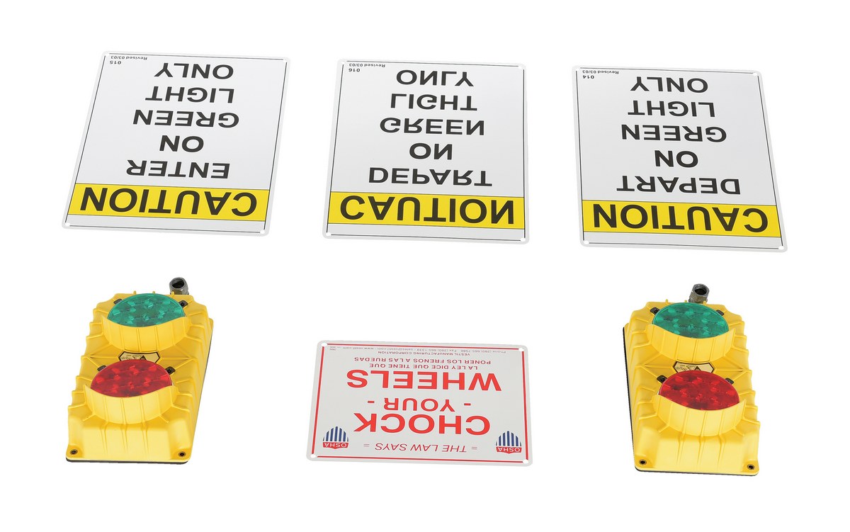 This dock traffic system features flashing red and green lights. Prevent accidents and injuries by providing clear communication between dock personnel and truck drivers. Built-in eyebrow type sun visors increase light visibility. This economy model comes with two yellow polypropylene traffic lights, each having a green and a red lens. The light containing a push-button is placed inside the dock area for the dock attendant, and the other is placed outside for the truck driver. Four signs are included. LED lights never need bulb replacements.