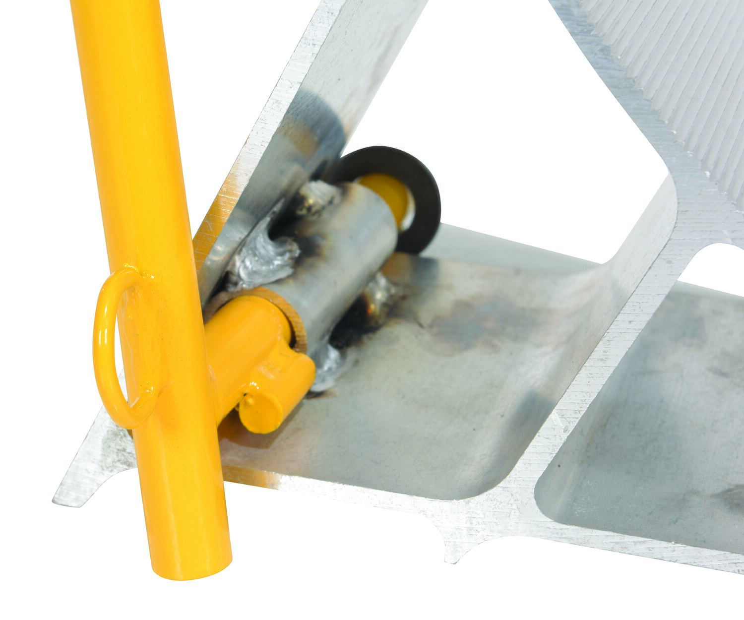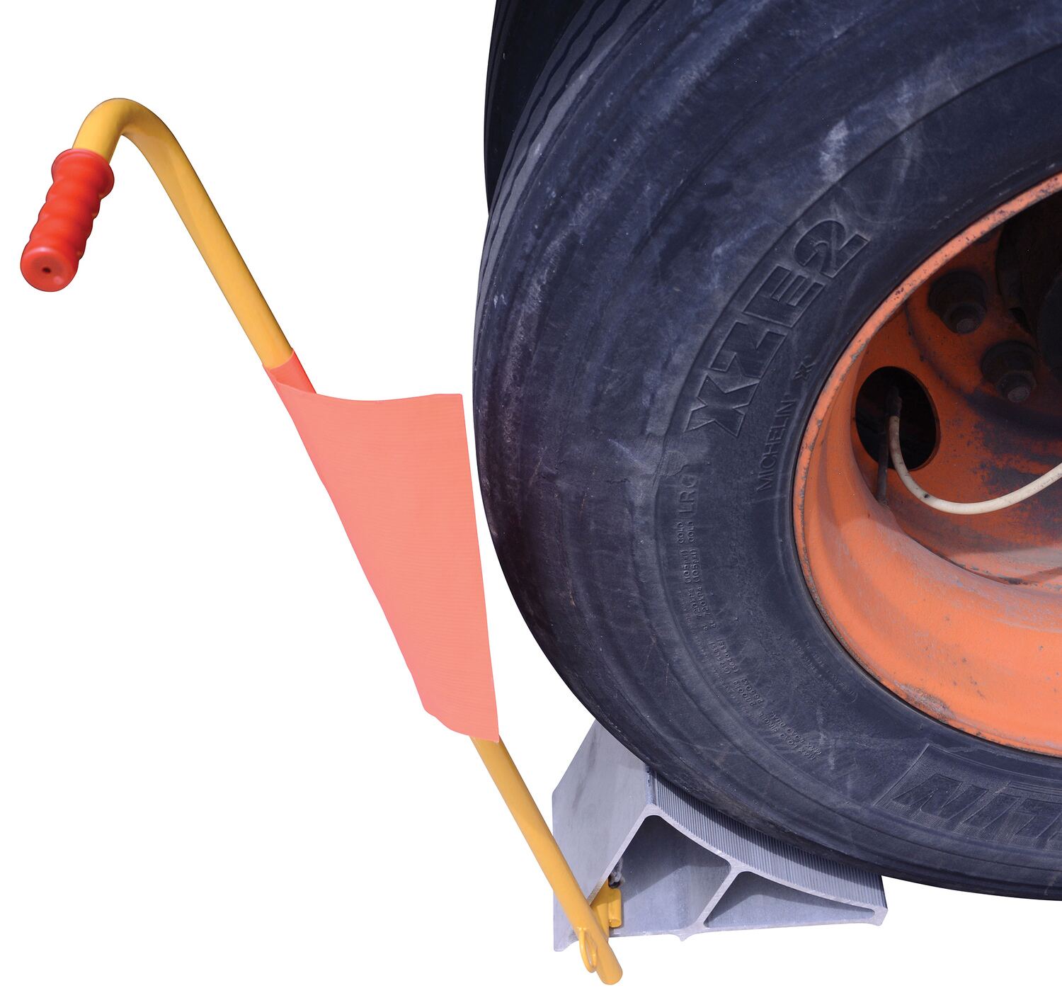 Aluminum Wheel Chock with Handle and Flag YellowThe aluminum wheel chock is ideal for maintenance and industrial facilities. The chock is constructed of extruded lightweight aluminum that is easy to handle. The unit features a serrated top to grip the tire and a triple edged bottom to grip the ground. An extended handle for simple maneuvering is included. D-ring provided for attaching security chain. A vinyl flag is included to provide added visibility and awareness to the chock. Chain not included.
