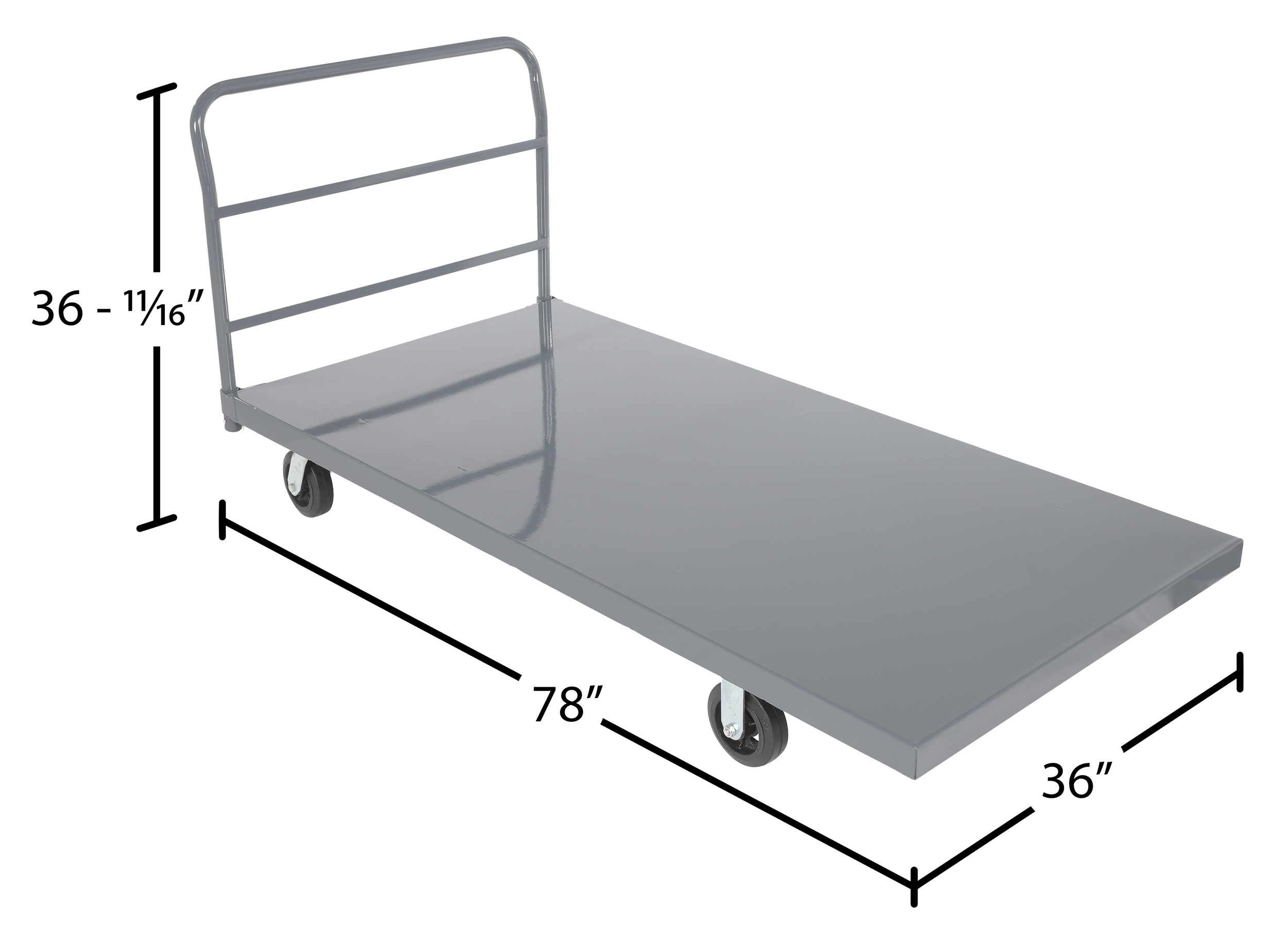 Steel Smooth Deck Platform Truck 36 In. x 72 In. 2000 Lb. Capacity GrayA steel platform truck is the perfect addition to any warehouse or shipping center. The steel platform design provides the user with a better sense of security. With a smooth surface, the amount of abrasion and scuffs during movement is limited. The steel handle allows the user to maintain an ergonomic posture while transferring goods. Mold on rubber casters roll smoothly. Powder coated finish provides added toughness.