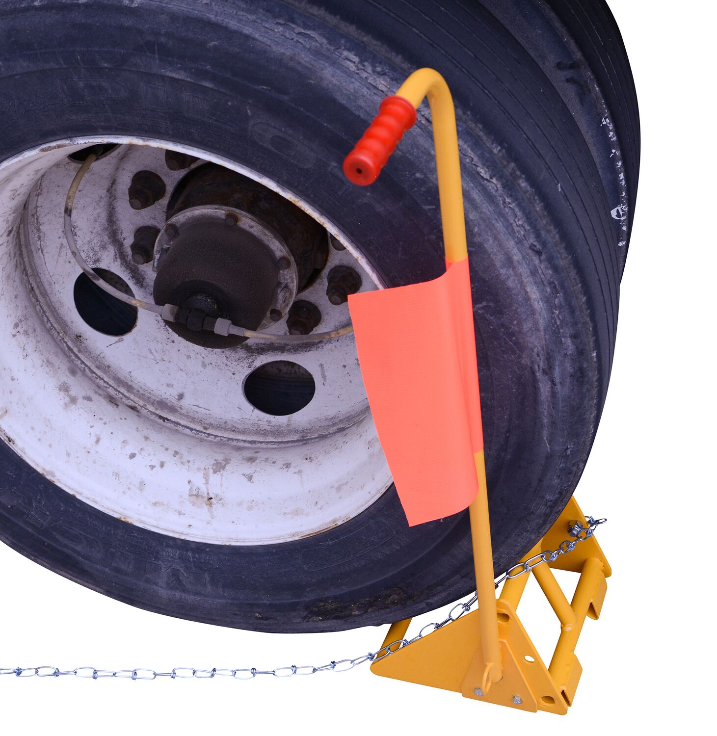 Fabricated Steel Wheel Chock With Ergonomic Handle and Flag Yellow