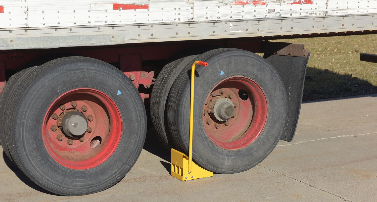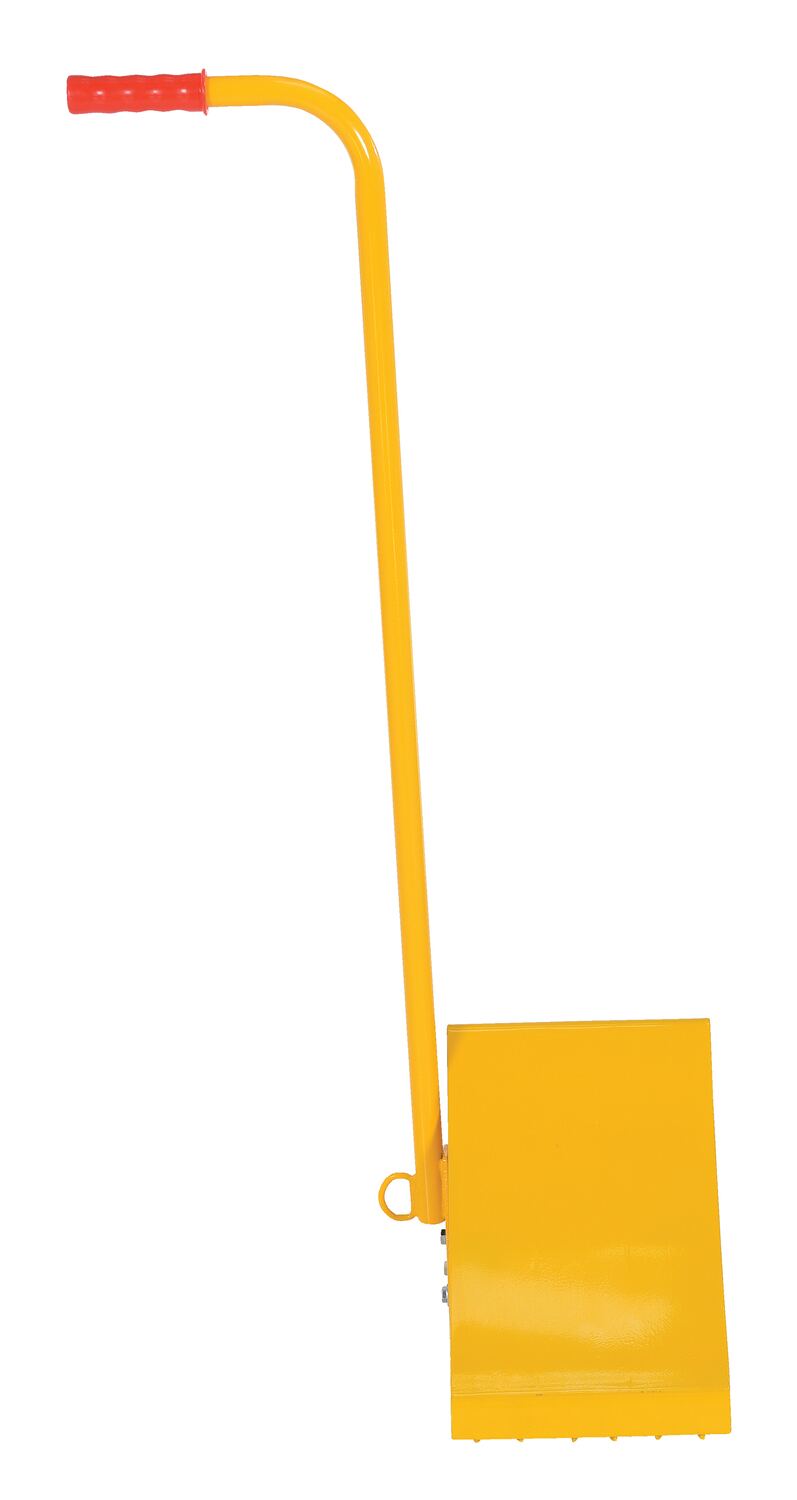 Fabricated Steel Wheel Chock With Ergonomic Handle 10-3/4 In. Length YellowThe fabricated ergo-handle Wheel Chock has an ergonomically design that makes it easy to move wheel chocks in and out of position under trailer wheels. It reduces the risk of back, knee, and foot injuries. The handle is constructed of steel and includes a yellow powder coat finish. Assembly required. D-ring provided for attaching security chain. Chain not included.