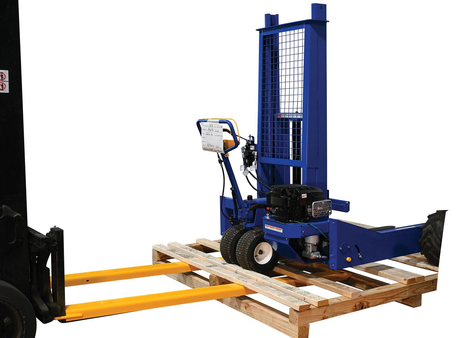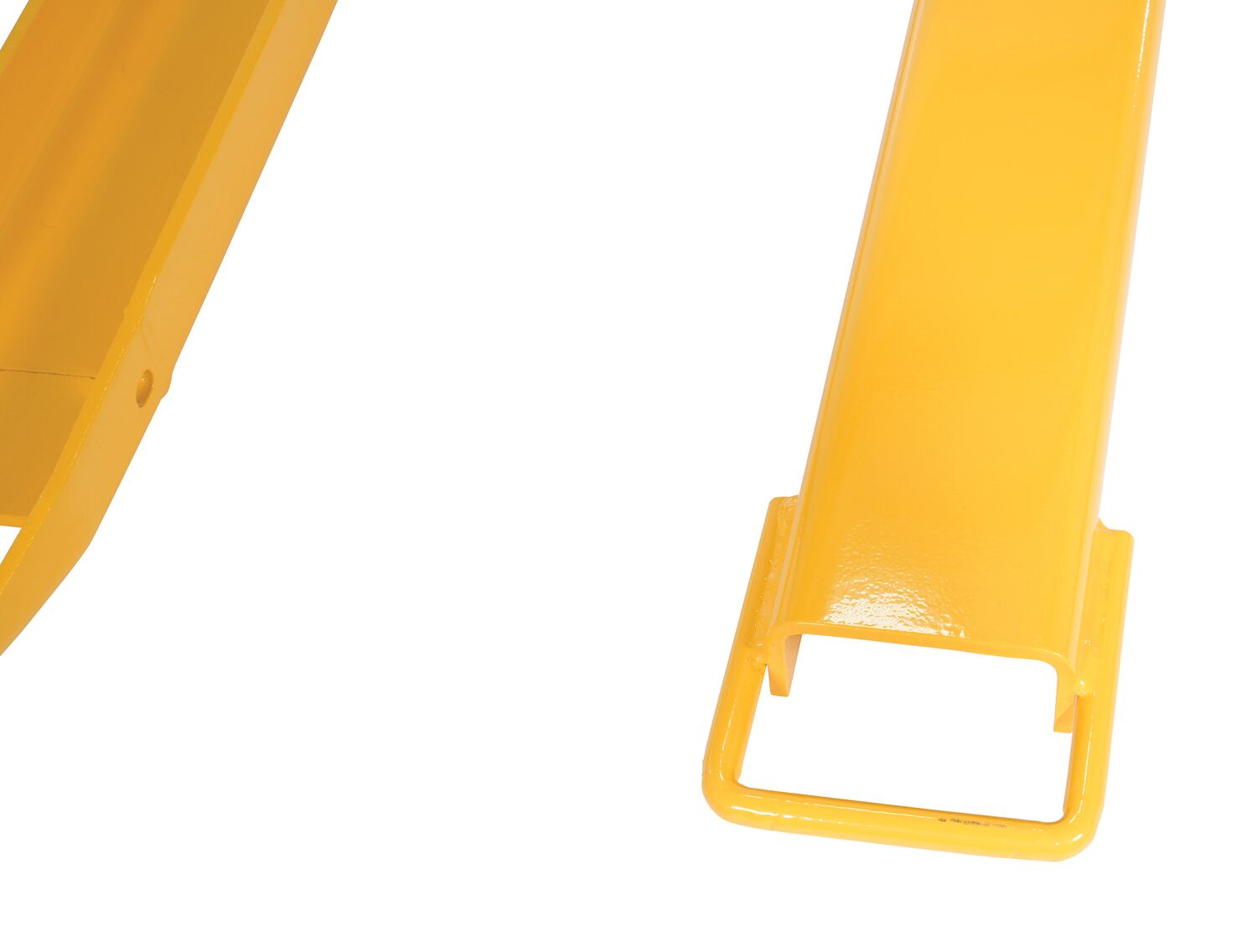 Steel Fork Extensions 4 In. x 90 In. 4000 Lb. Capacity YellowProvide the extra support needed to lift long or large objects with a fork truck using a pair of fork extensions. Welded steel construction with cast steel tips. Powder coat yellow finish. OSHA regulations require that extensions are no more than one-hundred and fifty (150) percent of the existing fork length. Insert loop at the tip of the fork and slide it up at a forty-five (45) degree angle. Then, lay it down over the existing fork. The rear spacer makes loading pallets into rear of trailer conveniently and easily. Practical for pushing pallets two or three deep into a trailer. To be used with class 2 and class 3 forks only.