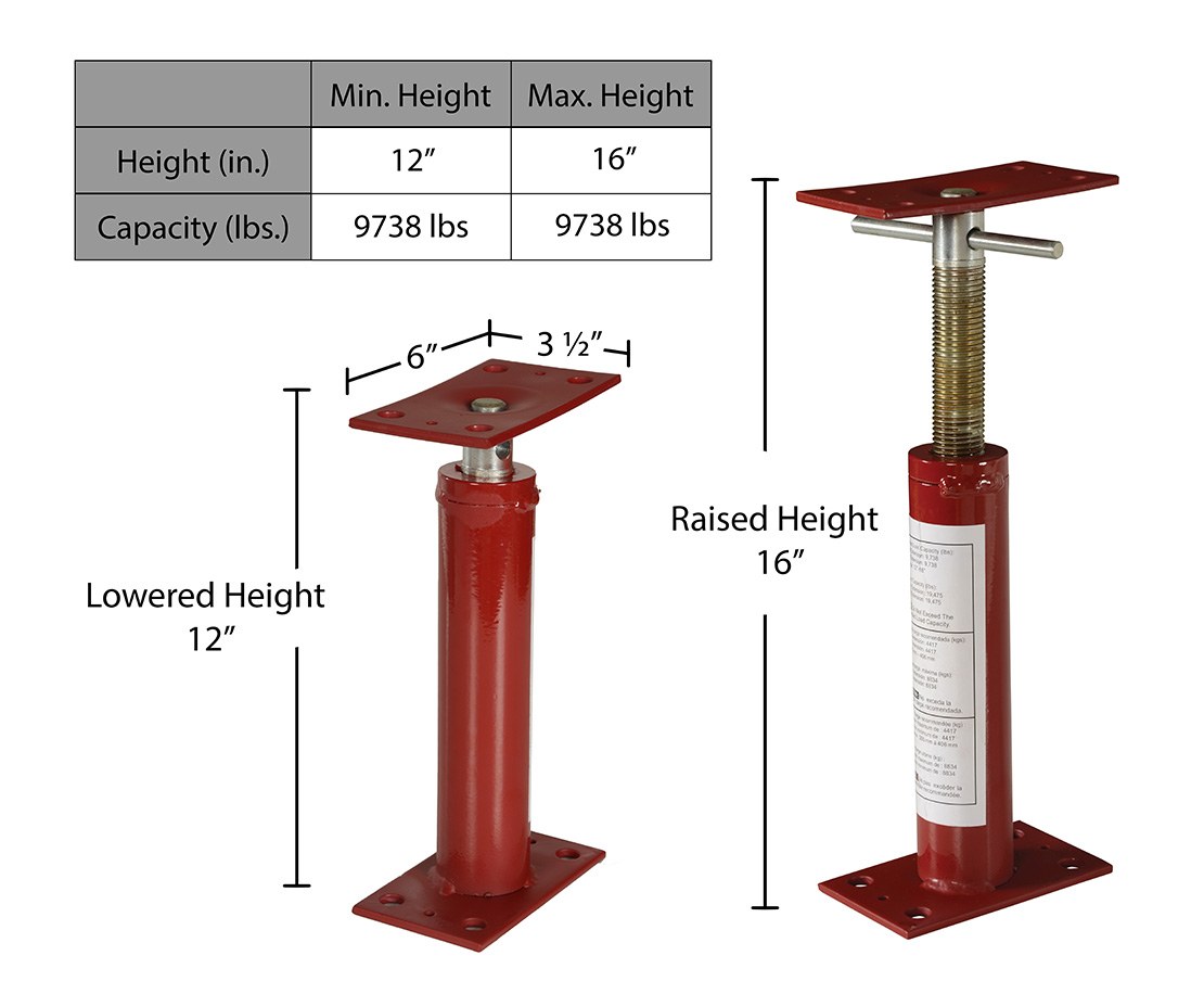 Height Minimum/Maximum (in.): 12 to 16 Capacity at 12" (lb.): 9,738 Capacity at 16" (lb.): 9,738