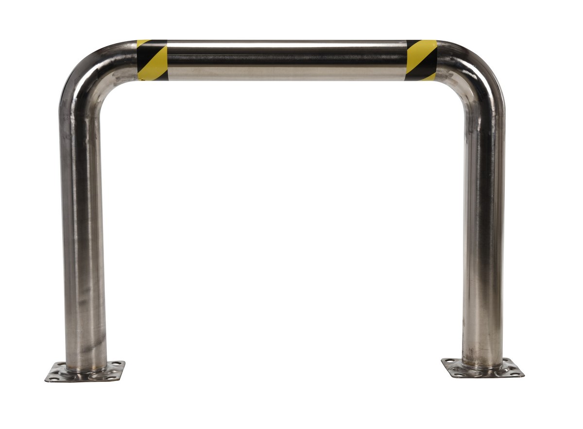 This High Profile machinery guard is heavy-duty welded steel construction for protecting racks, building walls, expensive equipment, and hundreds of other applications. Stainless steel polished finish. Two (2) base plates with four (4) pre-drilled mounting holes in each plate.