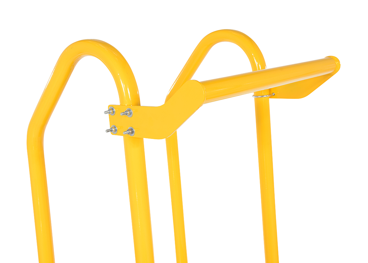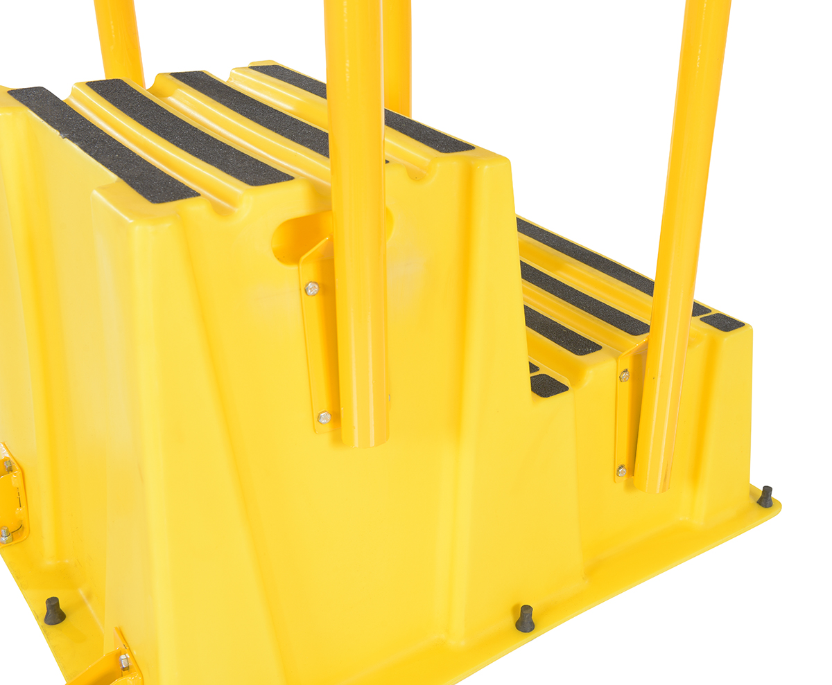 Polyethylene Nestable with Hand and Back Rails Casters 2 Step 500 Lb. Capacity YellowA poly step stool is a great asset for on the go or in a permanent setting. A lightweight design with front and side cutout handles, allow the user to easily transfer the stool to a preferred spot. The taped step surfaces ensure safe footing while traversing up and down the steps. Includes bolt on back rail, handrail, and casters. The hand rails height allows the unit to be pushed or pulled into the desired position, minimizing bending and twisting by the user. Steps can be nested to minimize footprint when not in use.