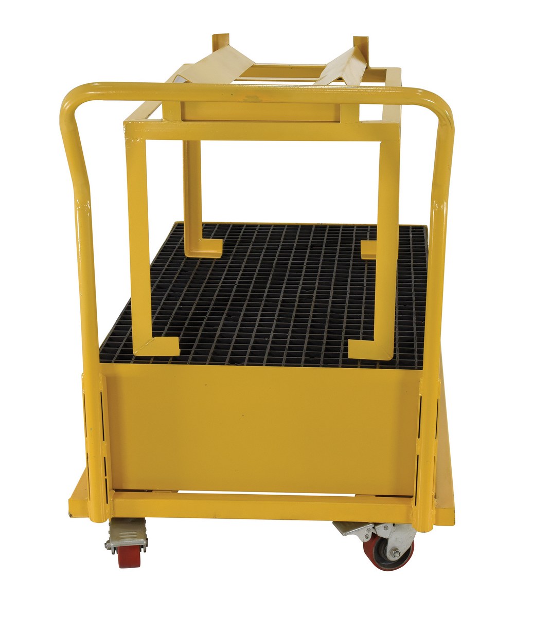 Transfer steel drums from area to area and then safely dispense the drums with this nonflammable steel retention basin cart. This unit is constructed of steel to resist extreme heat environments. A push handle is located at one end for easy maneuverability.