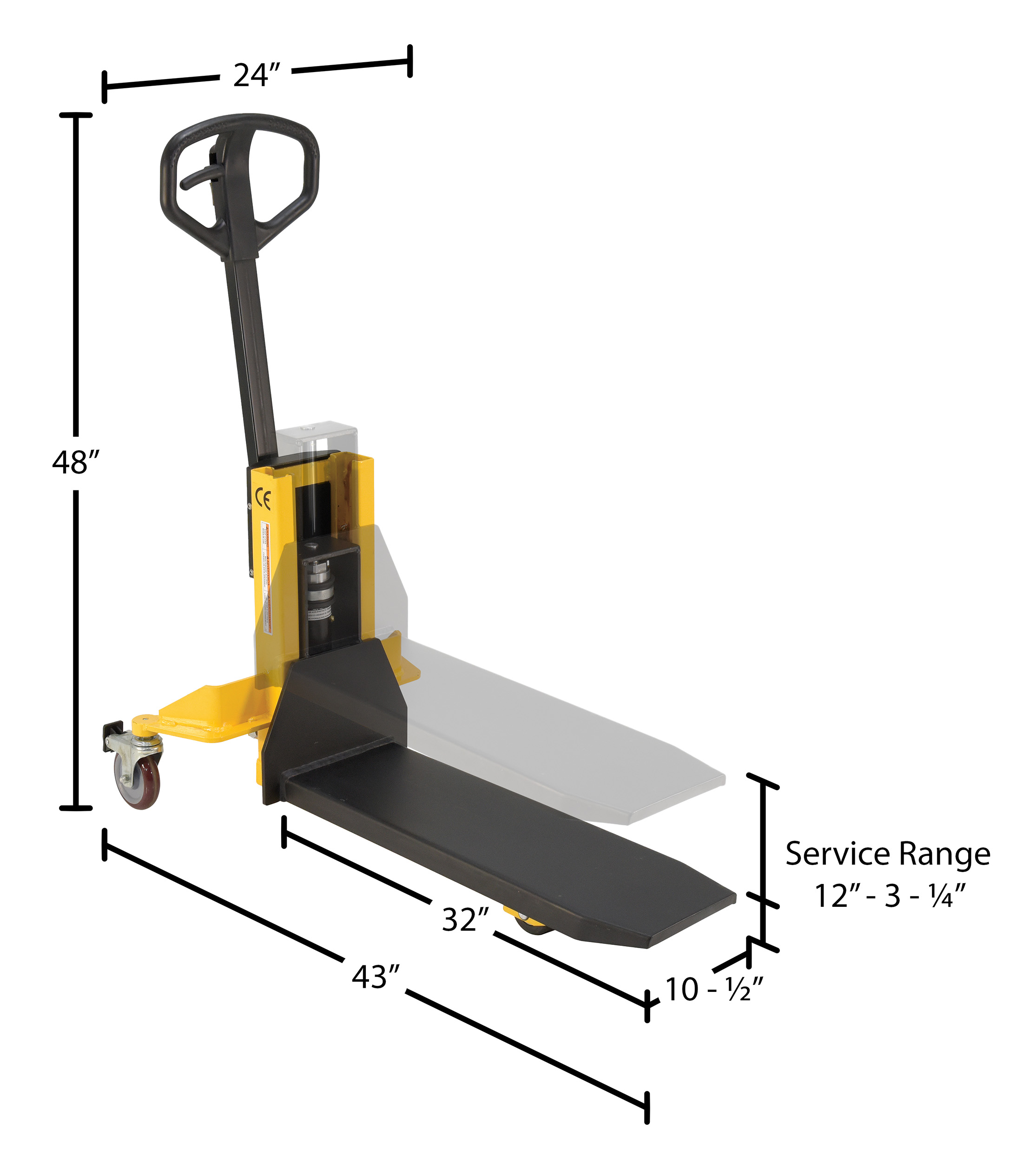 | Uniform Capacity (lb.): 800 | Service Range (in.): 3-1/4 to 12 | Fork Width/Length (in.): 10-1/2 x 32 |