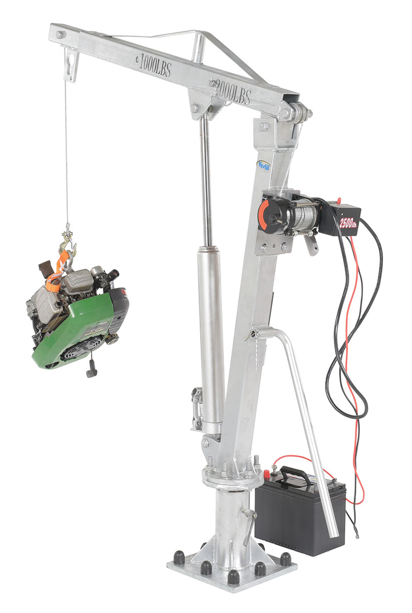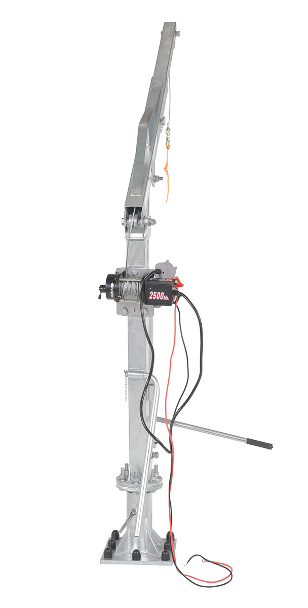 Galvanized Steel DC Powered Winch Truck Jib Crane 52 In. Reach 1,000 Lb. Extended Capacity GrayInstalled in your pick-up truck bed, this winch operated jib crane will help lift loads. Lift items from ground to truck bed height, then rotate into cargo area. Includes telescopic boom design with manual hydraulic hand pump to pivot boom up and down. DC powered cable winch to lift and lower loads. Unit comes with one fixed hook, one chain slot lock, and one cable hook with latch.